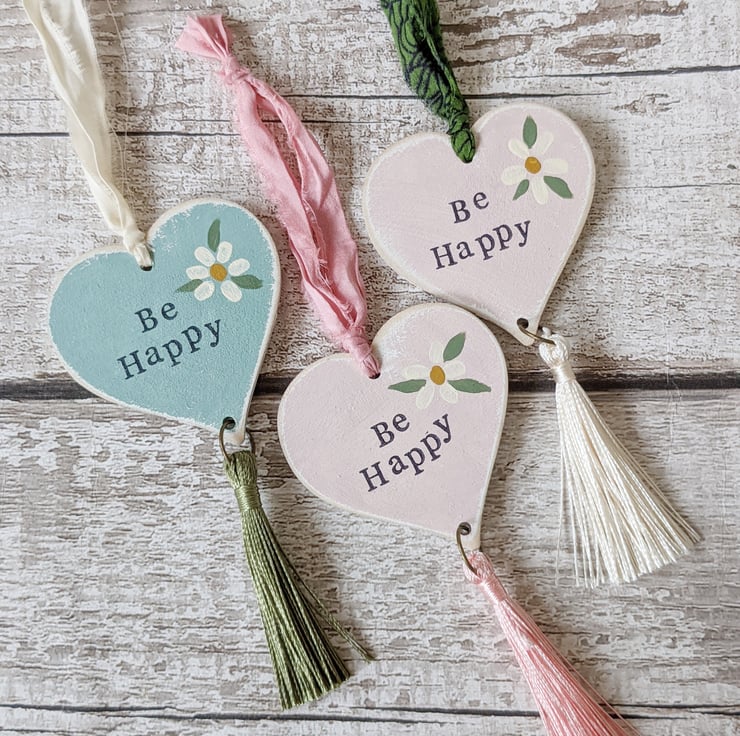 Hand painted with a pretty daisy motif and stamped words this one of a kind heart hangs on a sari silk ribbon with a pretty tassel.
