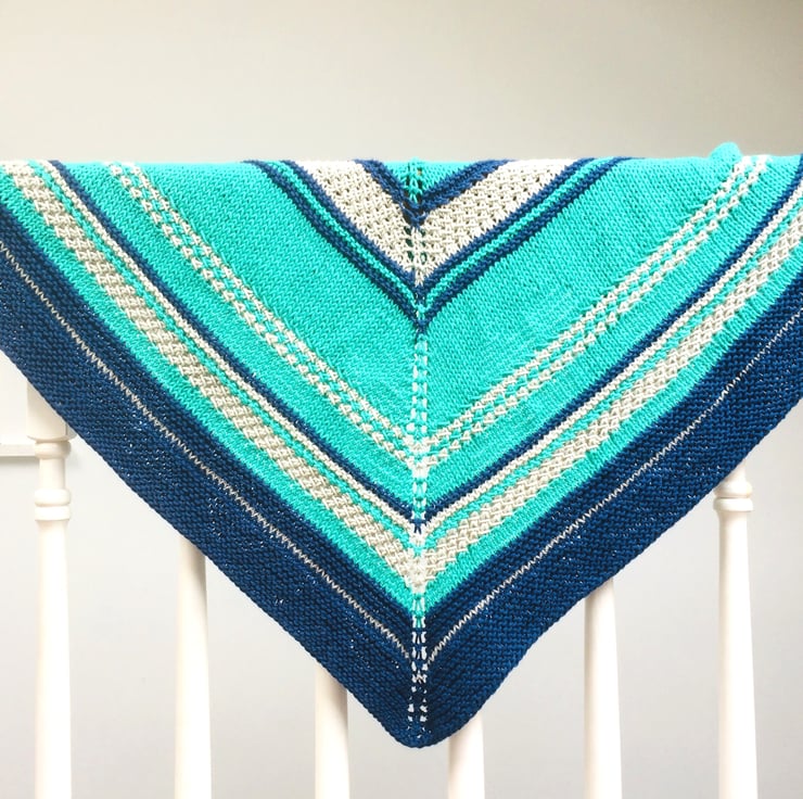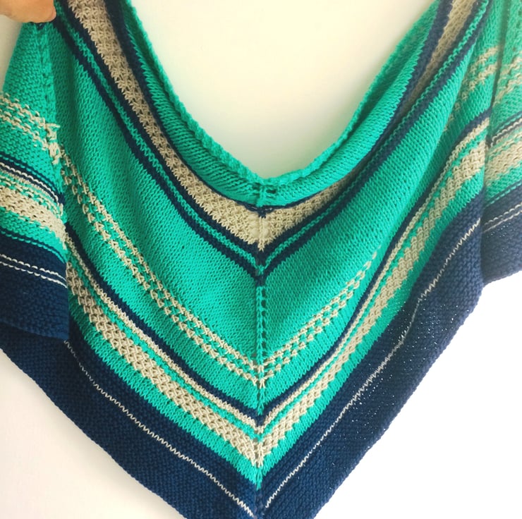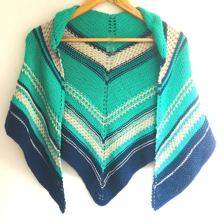 Easy knitting pattern for a triangular striped shawl knit in bright summer colours.Knit in a mix of garter stitch, lace and textual pattern.