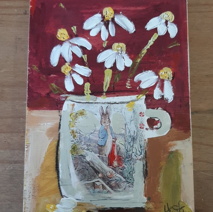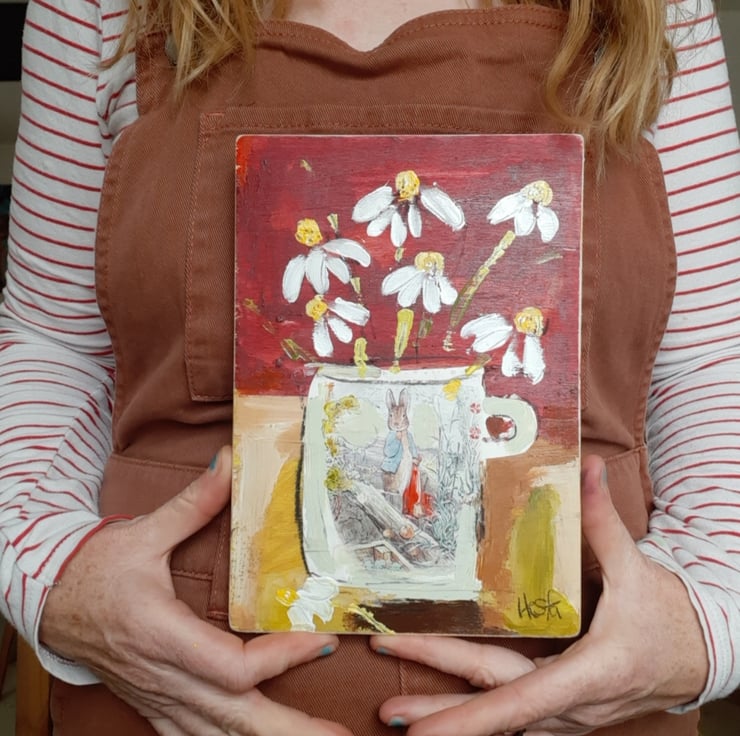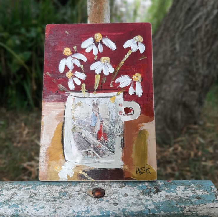This very sweet painting on thick reclaimed wood is both whimsical and a most happy painting of summer Daisy's measuring 14 cm wide 21 cm tall ready to hang, lightly varnished.