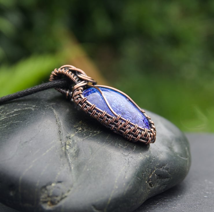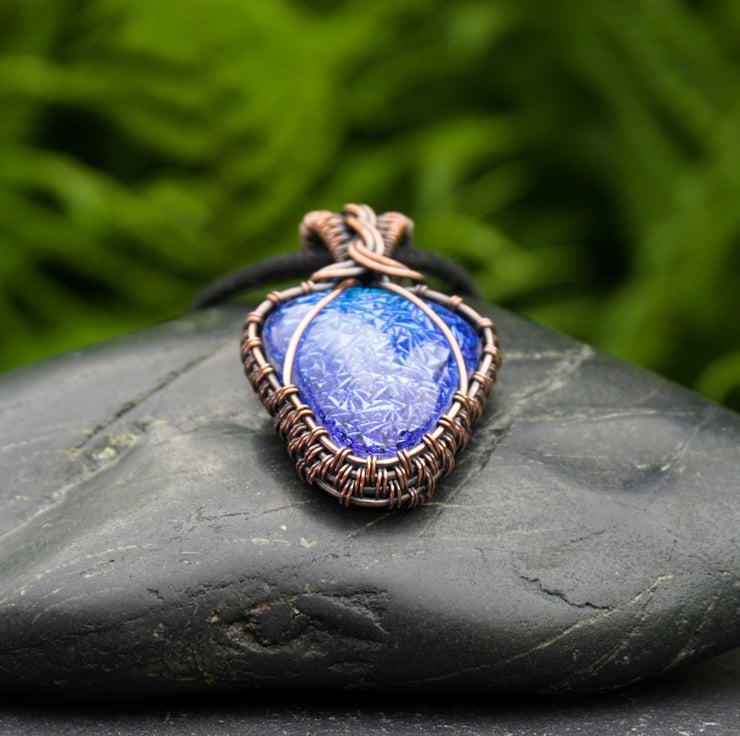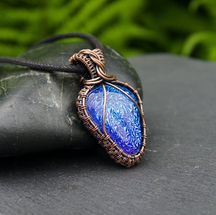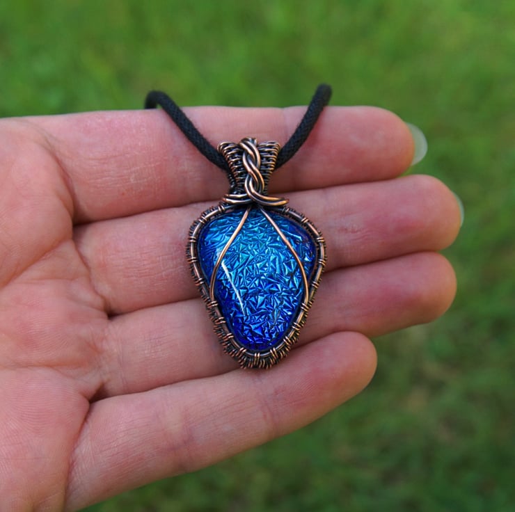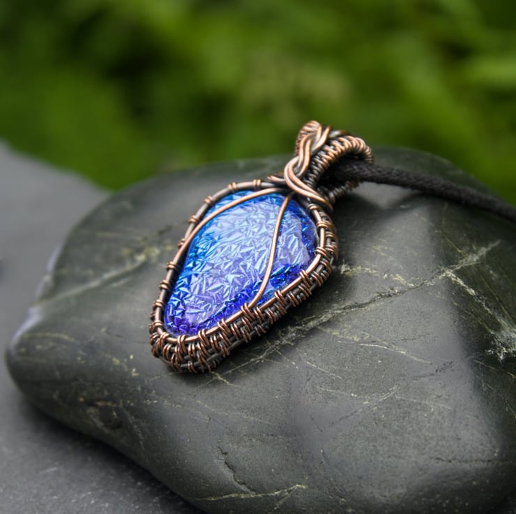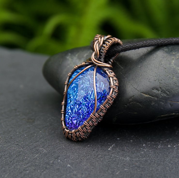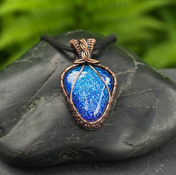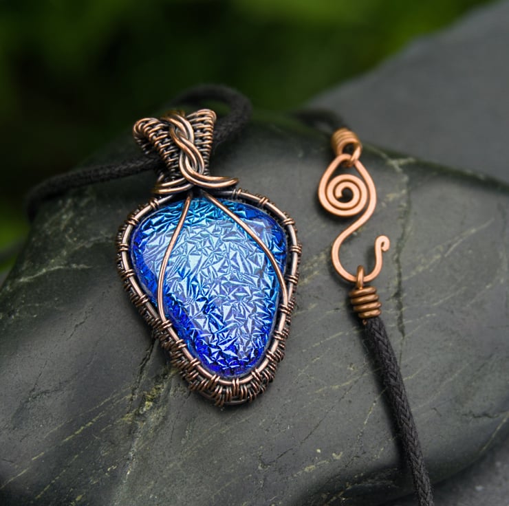 This stunning, one-of-a-kind pendant features a beautiful electric blue dichroic glass cabochon, which has been wrapped in copper wire. I’ve created a band of woven wires to wrap around the outside of the unusual arrowhead shaped glass. A wide woven bail has then been added, with a pair of bare wires forming an intricate twisted detail up and around the bail. The gorgeous bright blue dichroic glass looks absolutely fabulous next to the antiqued copper wire!