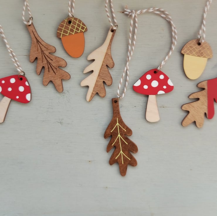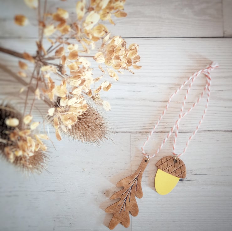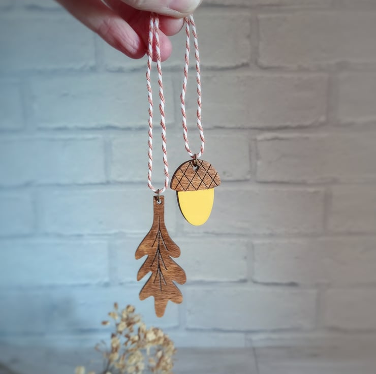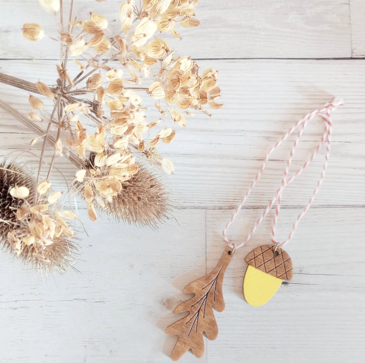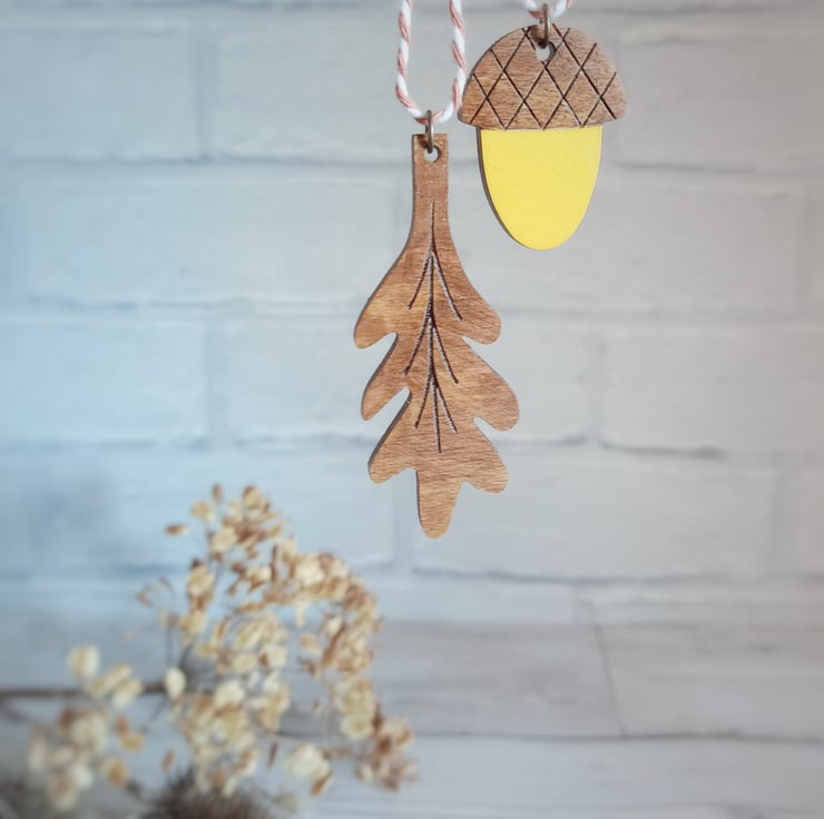 This decoration is made from 3mm laser cut and engraved birch plywood painted on one side. The leaf measures approx 7cm and the acorn 4.7cm at their longest points. The back of the decoration is stained so if you want to hang it in a window it will still look appealing from the outside.