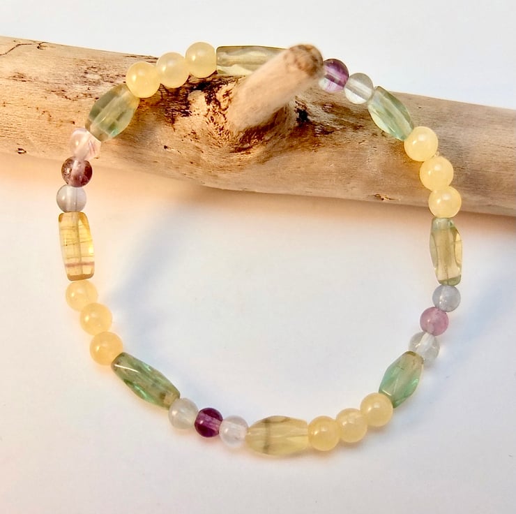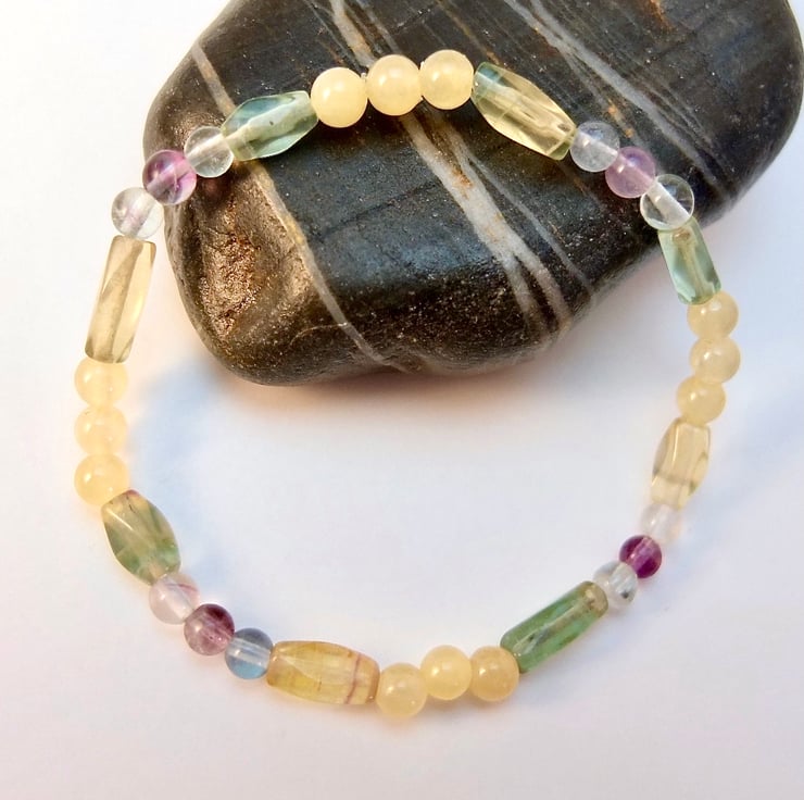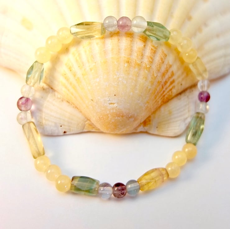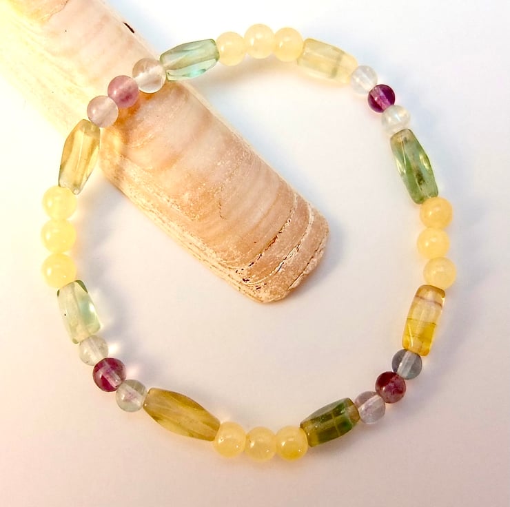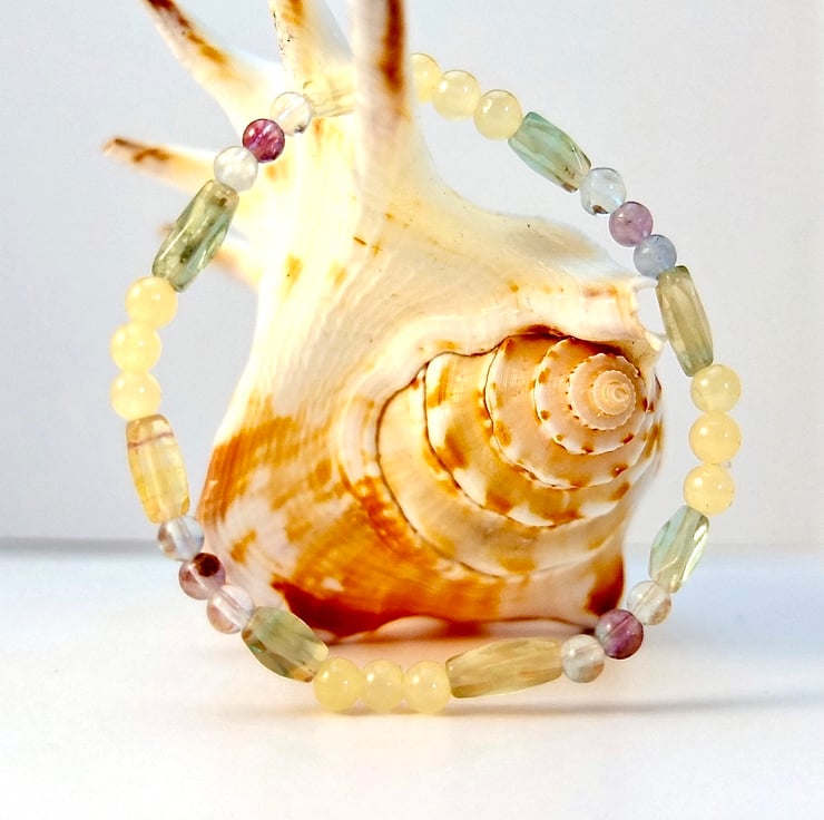 I have mixed the Ambronite with 4mm Fluorite rounds in a variety of pale, pastel hues - green, yellow, purple, pink and blue, and faceted Fluorite tubes in shades of yellow and green.