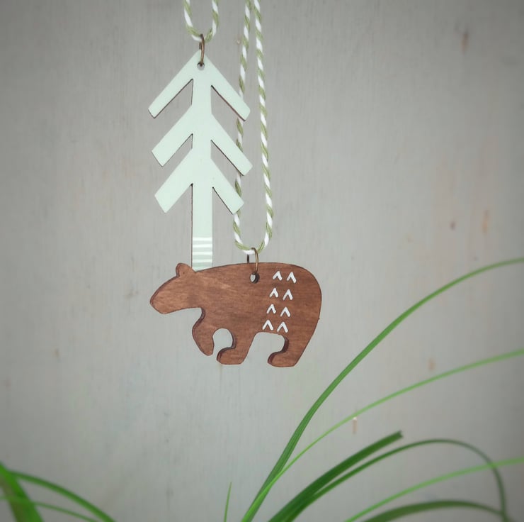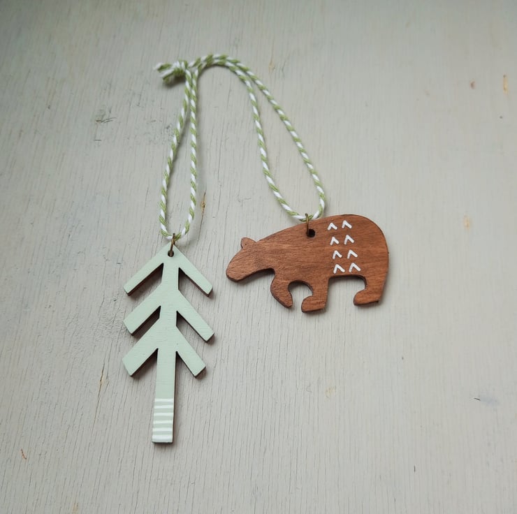 This hand-painted wooden decoration makes a perfect keepsake ornament, ideal for fans of nature and getting lost in the wilderness! It is an irresistible double decoration consisting of a bear and tree joined by two-tone twine.