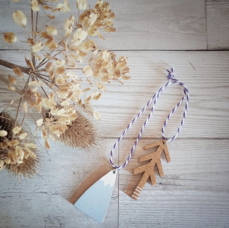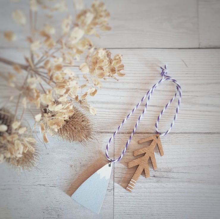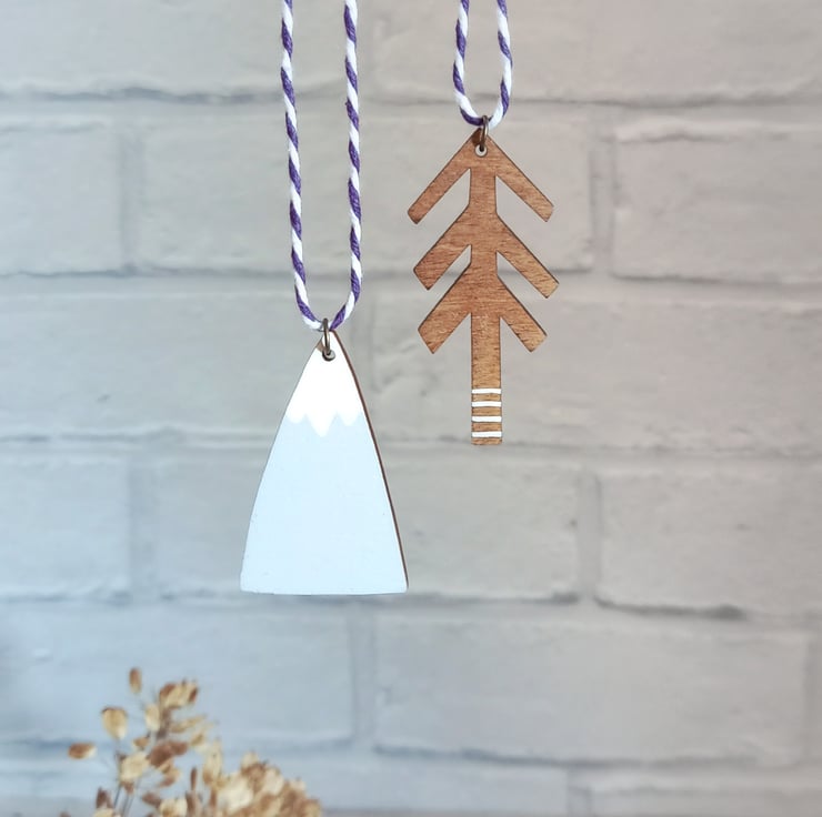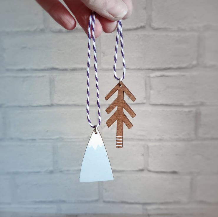 This hand-painted wooden decoration makes a perfect keepsake ornament, ideal for fans of nature and getting lost in the wilderness! It is an irresistible double decoration consisting of a mountain and tree joined by two-tone twine.