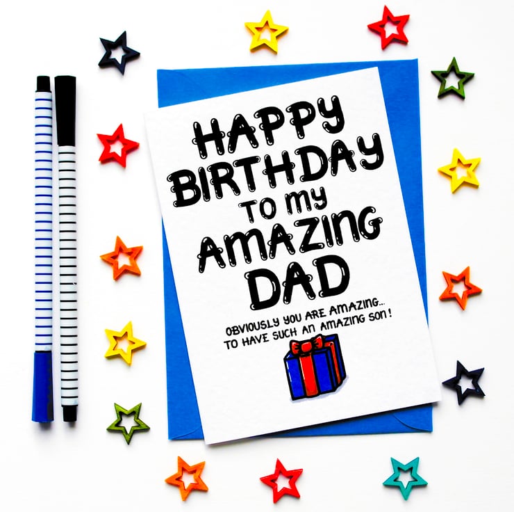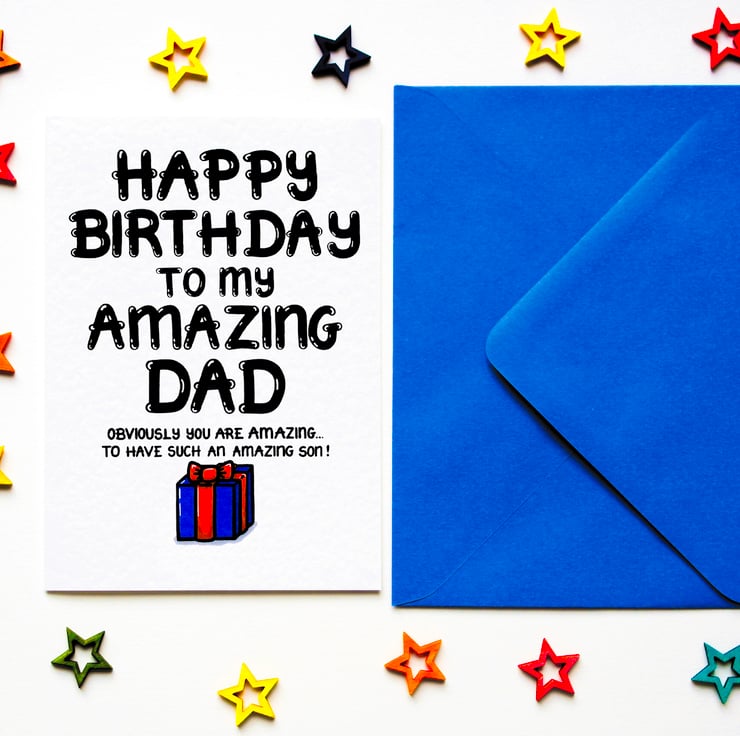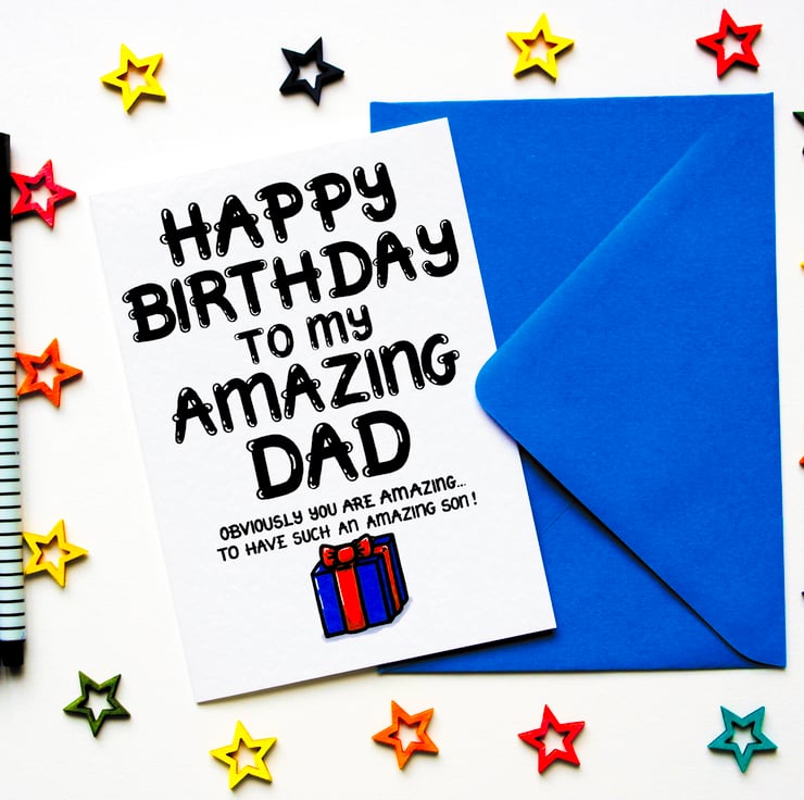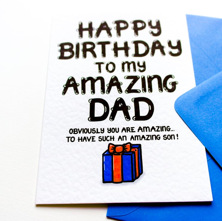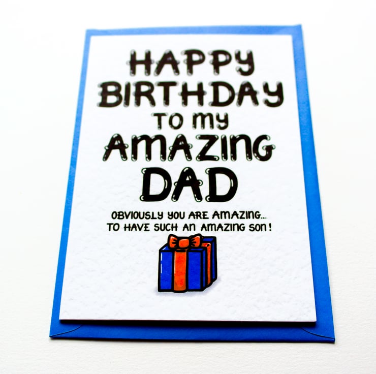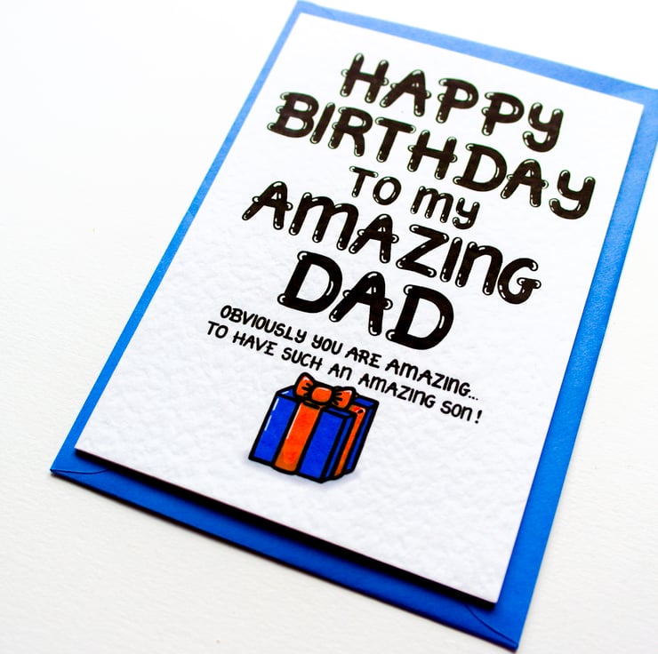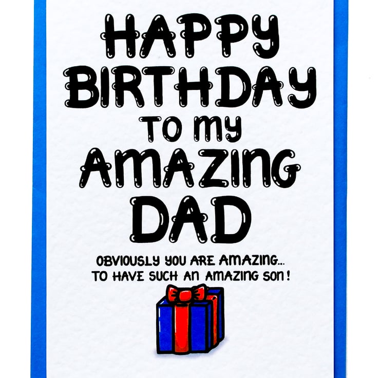 Greeting on front: HAPPY BIRTHDAY TO MY AMAZING DAD OBVIOUSLY YOU ARE AMAZING... TO HAVE SUCH AN AMAZING SON!