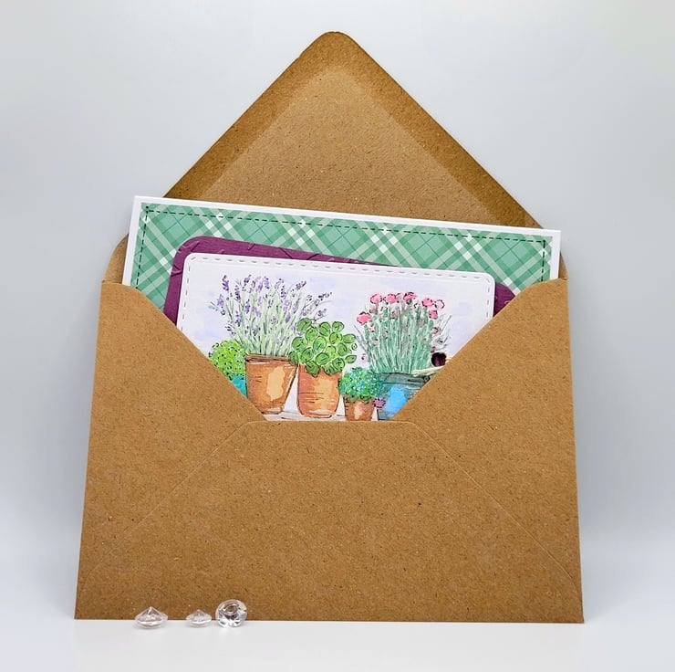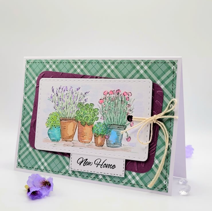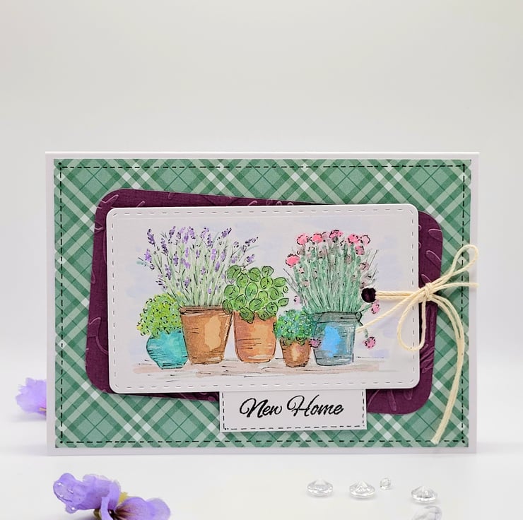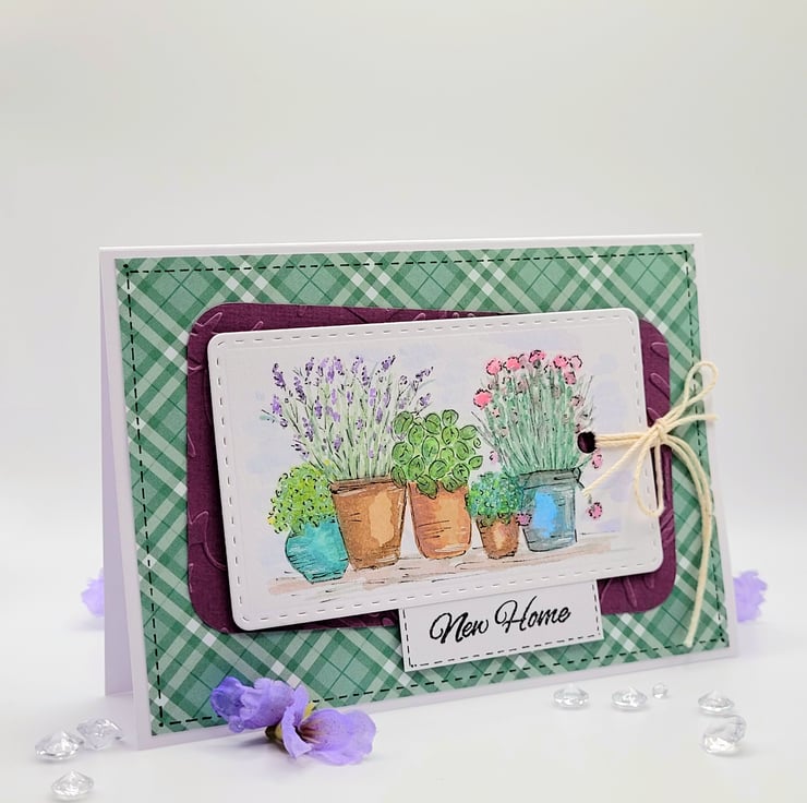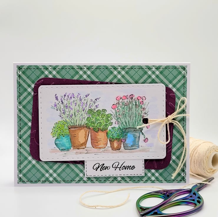 A handpainted layered watercolour NEW HOME card, measuring 10.5 x 15 cm and featuring pots of herbs and plants on a watercolour panel. The layered design has an embossed leaf panel on plain coloured card and a homely checked background paper.