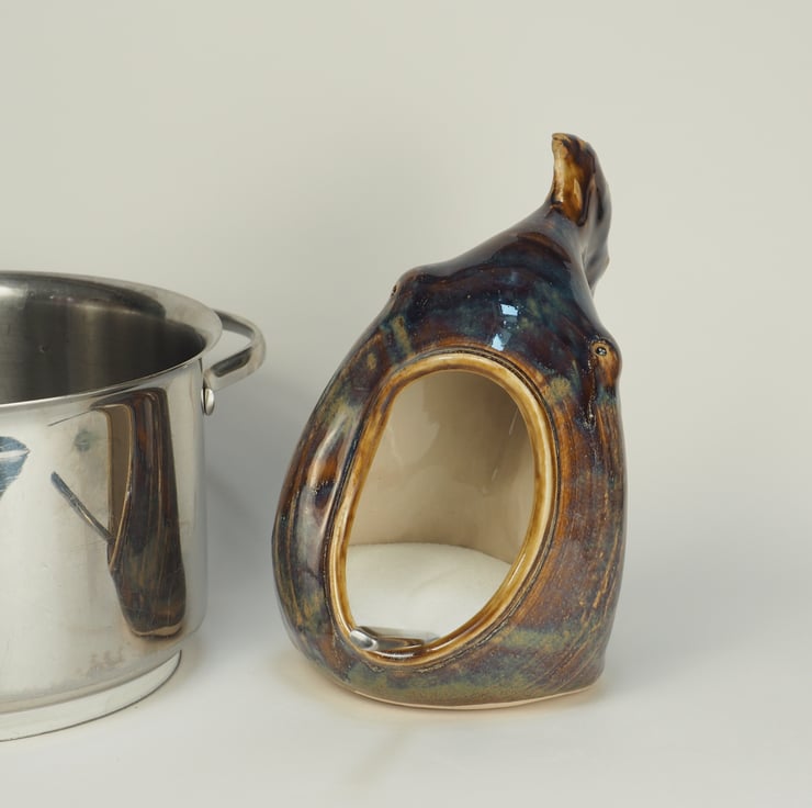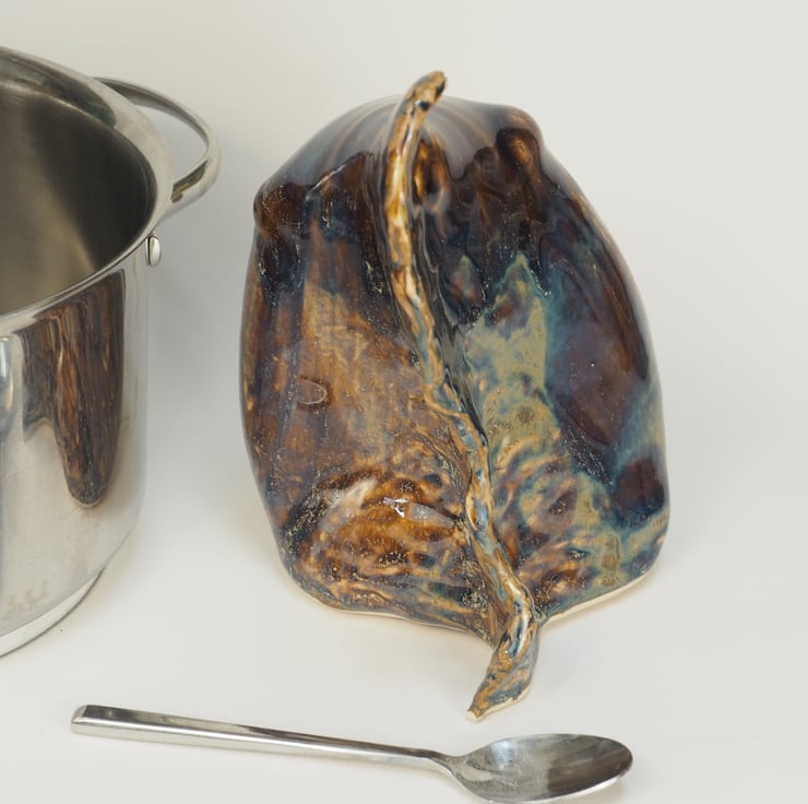 Finished in a richly coloured brown glaze on the outside, and foodsafe transparent on the inside.