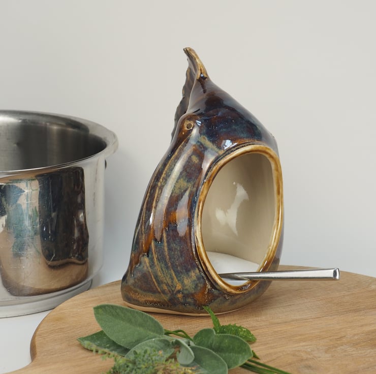I've been making fish for a while, and I was getting lots of questions and comments at markets: Can you put something in them? What are they for ? What about a Salt Pig ? So on the basis that you should always listen to your customers here are the SALT FISH ! They have a bigger mouth and smoother inside which is glazed in transparent to make it food safe.