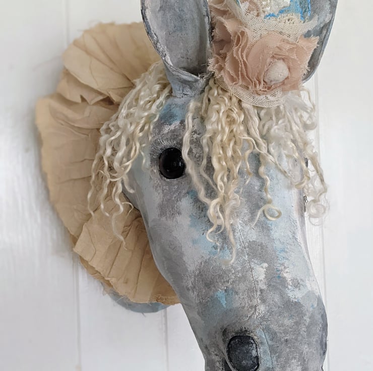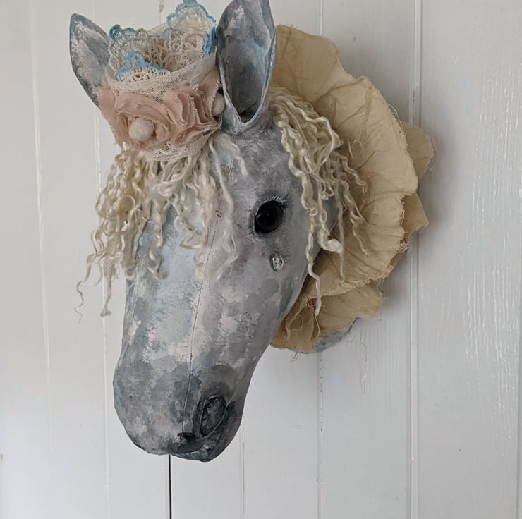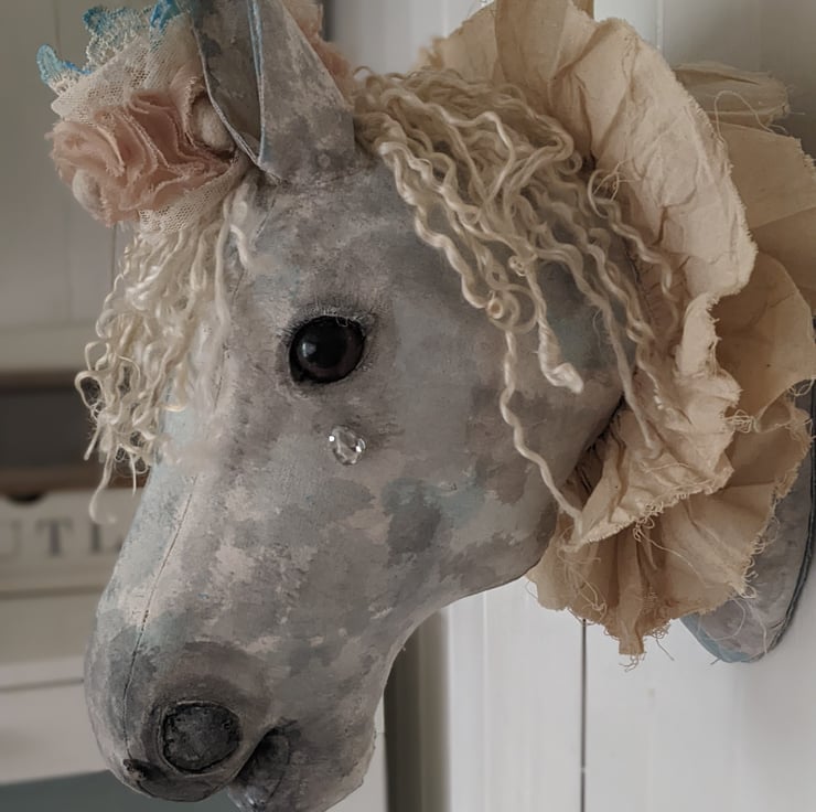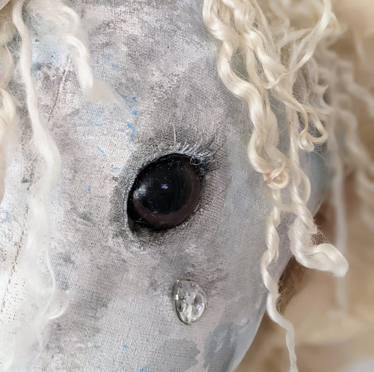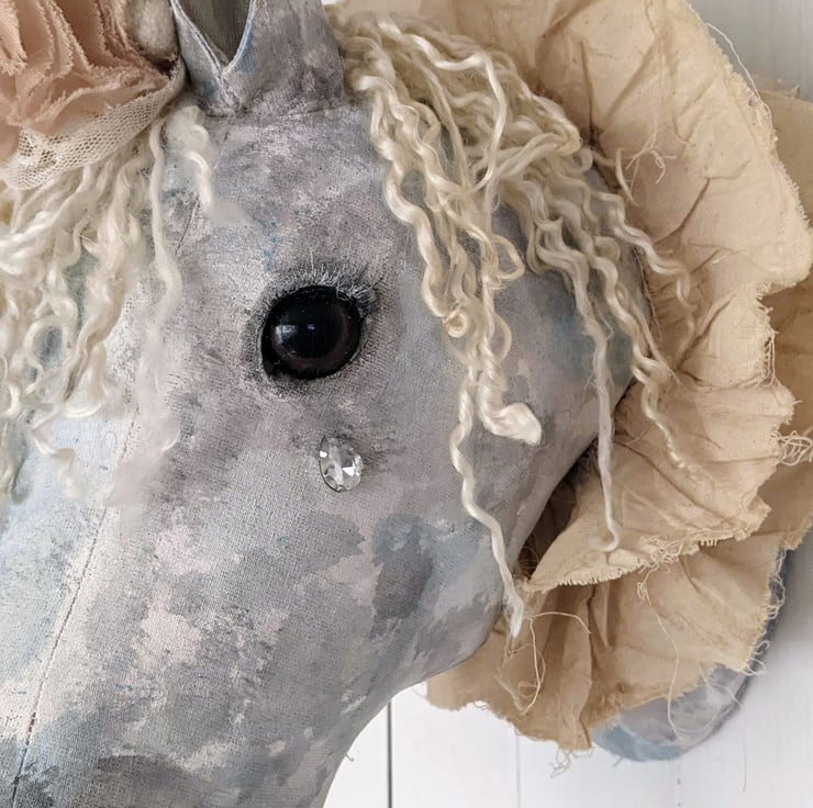 This piece is hand and machine stiched as well as hand painted. It's mane is made from premium Teeswater locks, a stained calico ruffle sits around its neck and a lace crown tipped in blue with an antique deep cream fabric rose trim, a little rhinstone tear falls gently from its eye, a metal D ring is on the back for easy hanging.