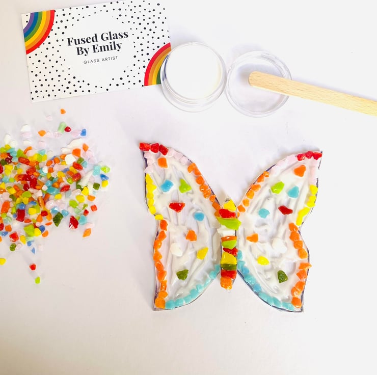 This kit is to decorate a Fused Glass Butterfly and a mixture of coloured glass is included for you to create your own unique design. Once your creation is complete and it has dried you will then wrap it back up in the same packaging it arrived in and post back to me (stamp included). Once I have received your Butterfly back I will add a hook and fire it in my kiln where the temperature will go up to over 900c, once cool I’ll tidy it up add some string and post it back to you, usually this will take about 7 days.