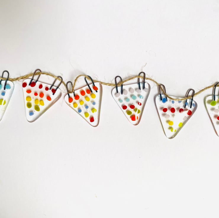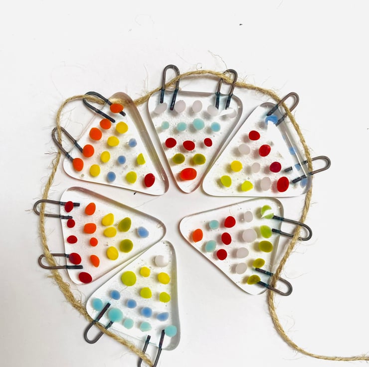 This kit is to decorate a Fused Glass Mini Bunting and a mixture of coloured glass is included for you to create your own unique design. Once your creation is complete and it has dried you will then wrap it back up in the same packaging it arrived in and post back to me (stamp included). Once I have received your Mini Bunting back I will add a hook and fire it in my kiln where the temperature will go up to over 900c, once cool I’ll tidy it up add some string and post it back to you, usually this will take about 7 days.