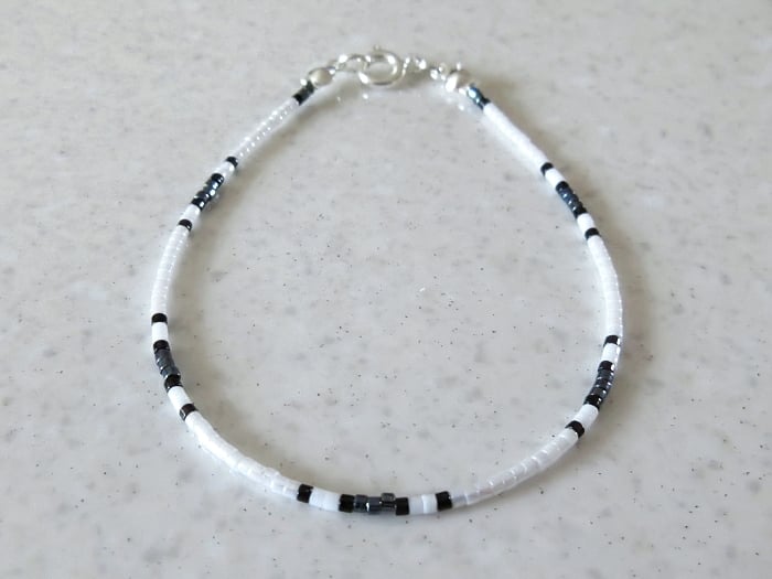 In this bracelet there are shiny black & white seed beads separated with a hematite shade.
