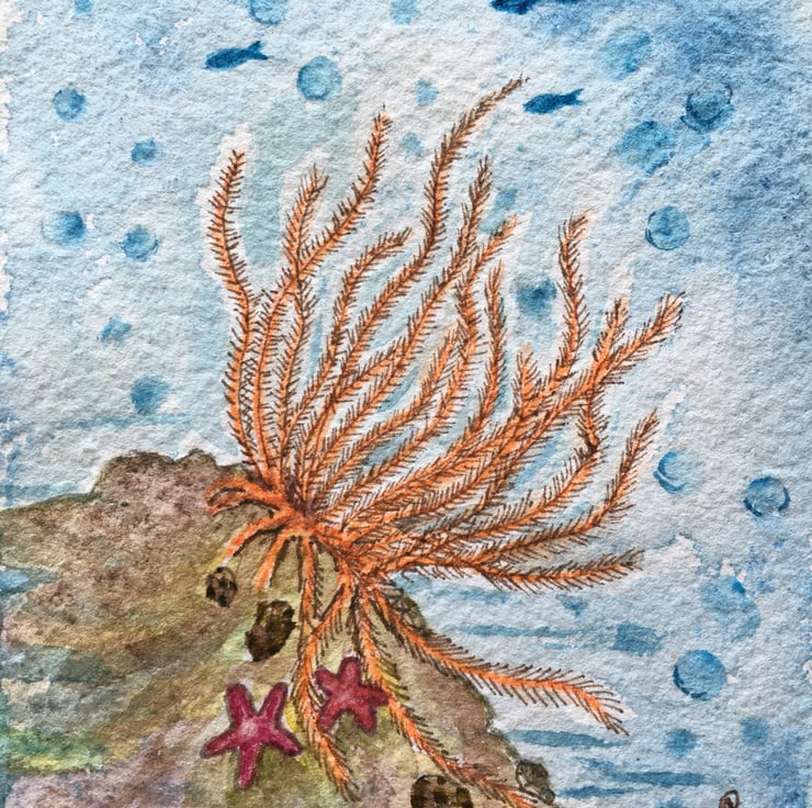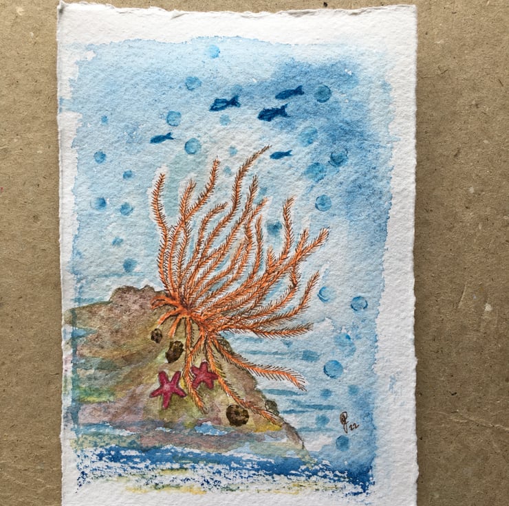 This small original underwater scene measures 15cm x 10 cm and is hand painted using Artist quality watercolours on hand made Khadi watercolour paper. It will be sent with mount in a cello bag within a sturdy envelope, free postage to UK destinations.
