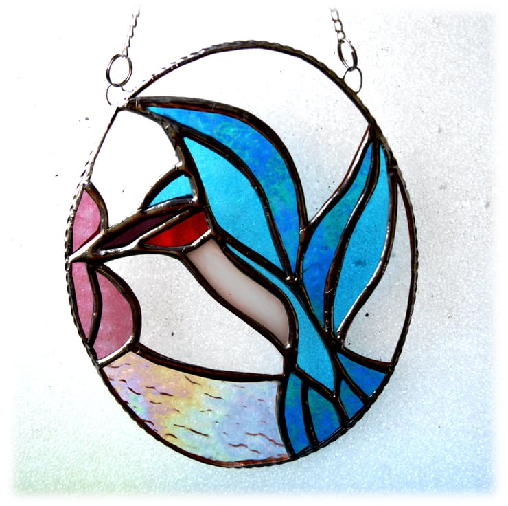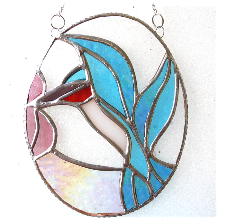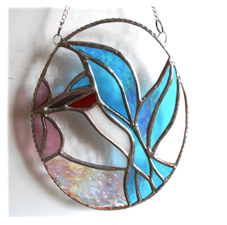 Please note that this suncatcher contains a high percentage of iridised glass. . It gives a wonderful effect. The solder near the iridised glass is more liable to slight tarnish than on non-iridised glass but this is not a fault and makes no difference as not visible when hanging in the light.