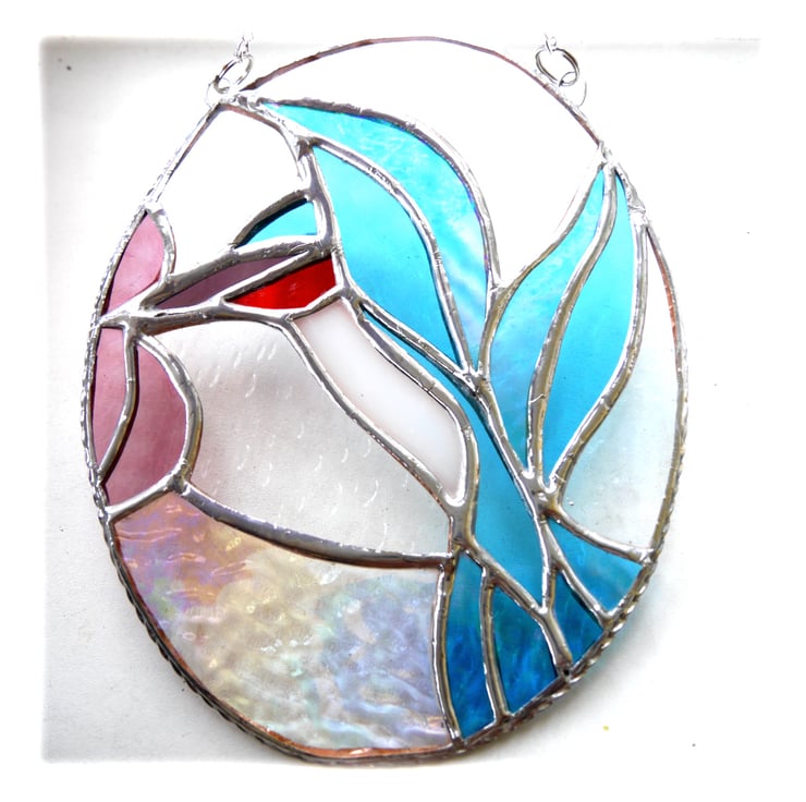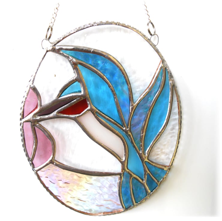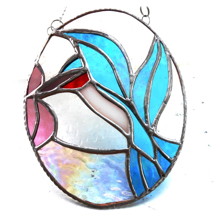 The suncatcher is in the form of an oval picture showing a bright shiny Kingfisher. The bird is fluttering its wings and has its beak in the middle of a bright Rose-Pink flower.