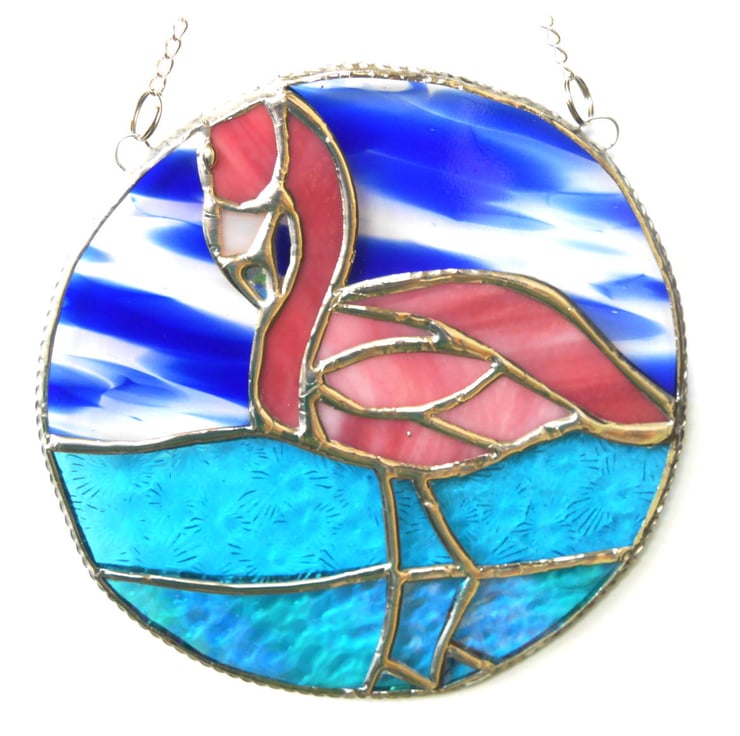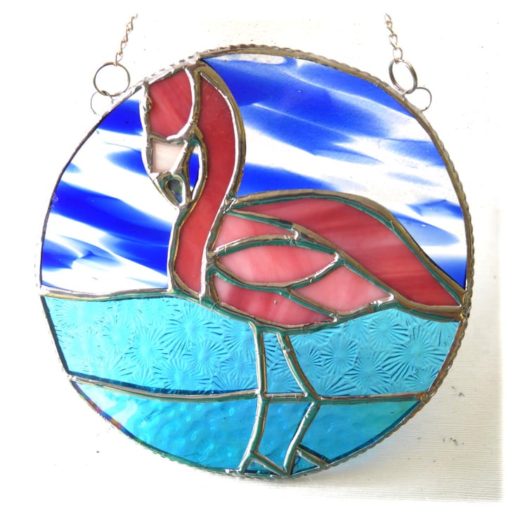 The suncatcher is in the form of a circular picture showing a bright pink long legged Flamingo. The bird is standing on its long legs in turquoise water with a pretty blue sky above.