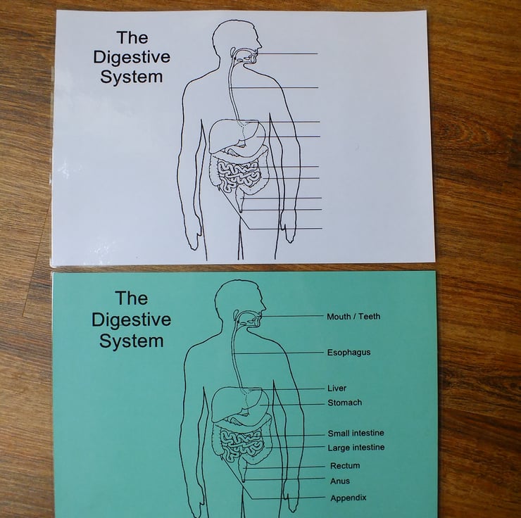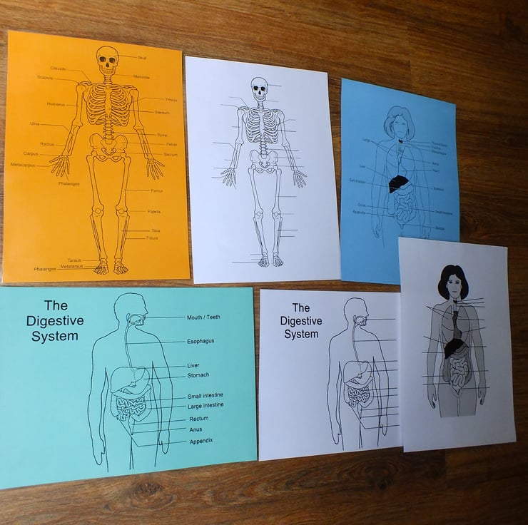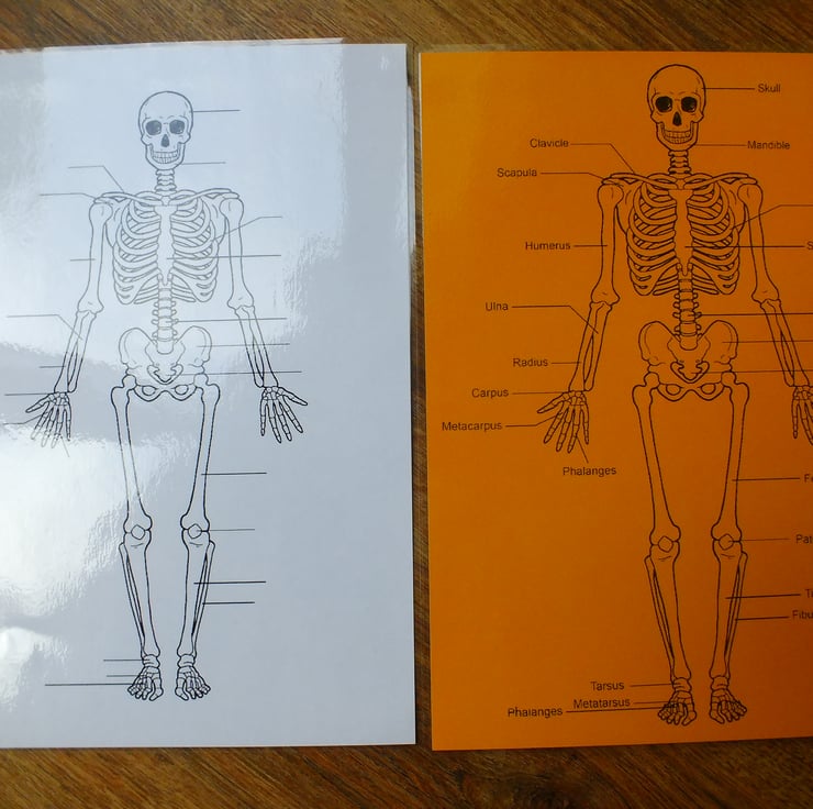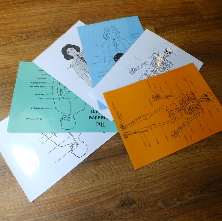 These A4-size revision diagrams include the skeleton, the organs, and the digestive system. With each labelled diagram is a blank version (all are laminated), so that the student can practice labelling the different parts using a whiteboard pen, as many times as necessary. Ideal for KS2 pupils learning human biology.