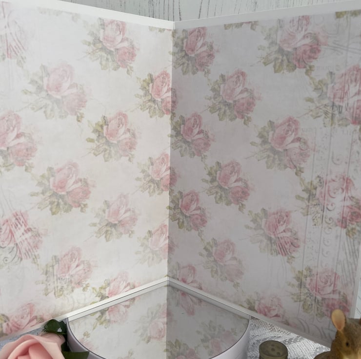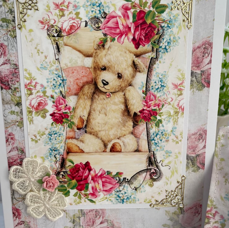 A5 white card with rose printed background. Delightful vintage teddy bear design printed onto photo card and mounted onto white card. Lace flowers stitched on my embroidery machine. Paper rose and gold corners to the main image.