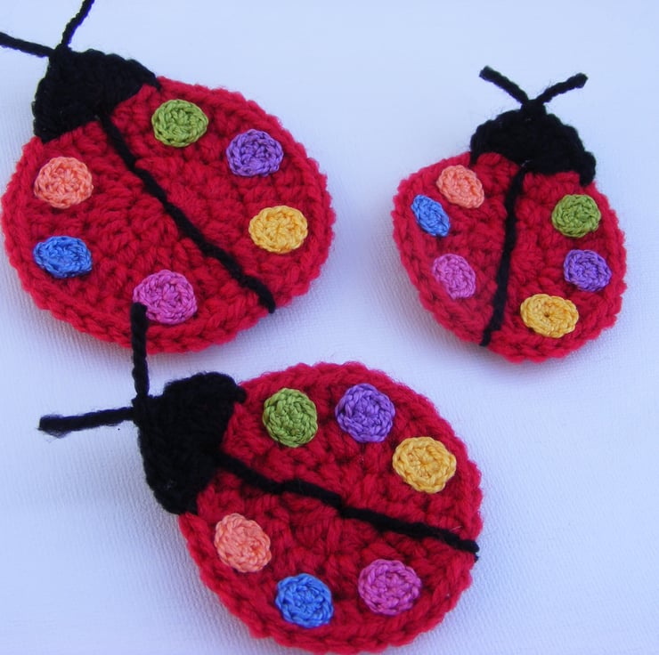 Super cute crochet lady bird embellishments. Set includes 1 large ladybird (7cm) and 2 small ladybirds (5.5cm). Available in 2 different designs either black spots or colourful spots.