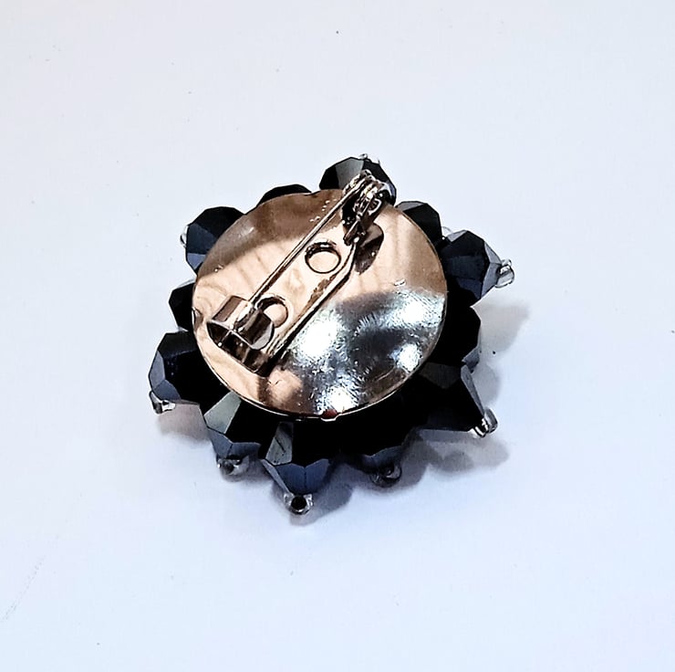 This neat little brooch measures approx 3 cm across and is hand made from 4 mm black crystal beads. The crystals are individually strung onto a silver plated brooch base