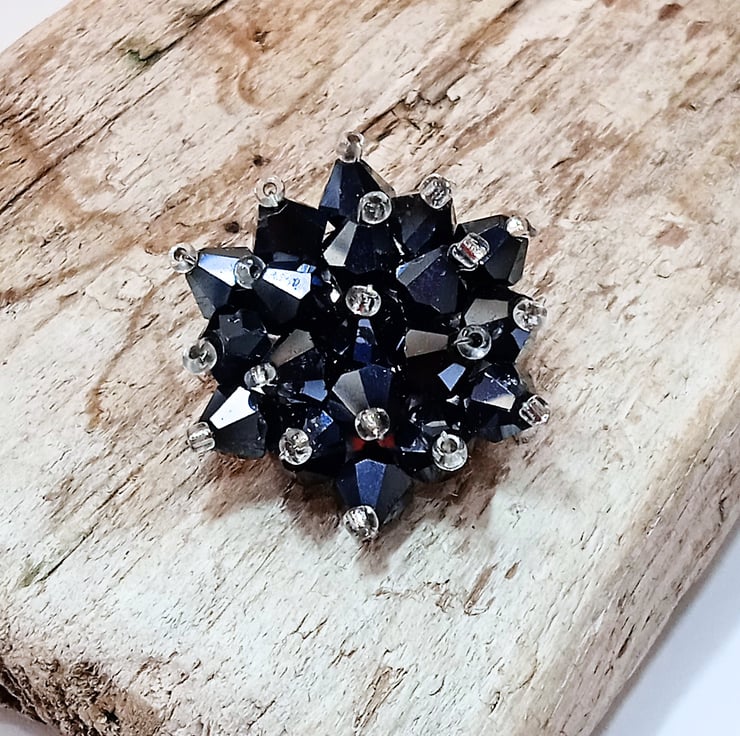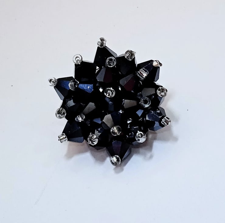 This neat little brooch measures approx 3 cm across and is hand made from 4 mm black crystal beads. The crystals are individually strung onto a silver plated brooch base