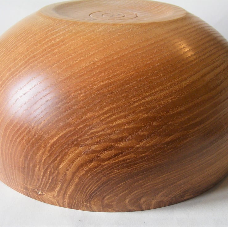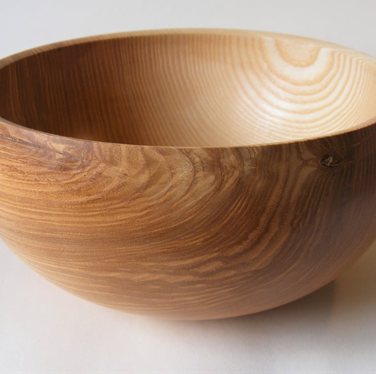 A large Olive Ash Food/salad or fruit bowl, 210 x 102mm (21 x 10.2 cm). A really nice olive ash bowl, which could be used as a decorative piece or as a food bowl, for serving or storage. It has a nicely curving shape that comes in at the top to a narrow in sloped rim. The colours change across the piece from light out wood to darker swirling colours of the heart of the tree.