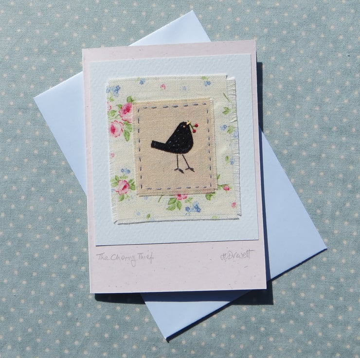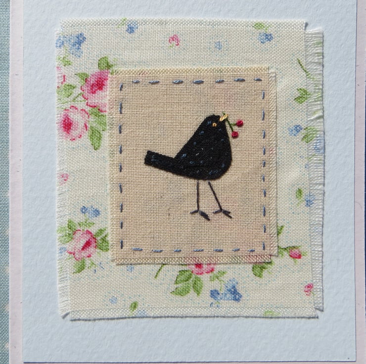 A unique hand-stitched miniature applique with embroidered details. The little blackbird is cut from cotton fabric, the central panel is stitched to a pretty cotton print fabric. Perfect for any number of occasions - a card to keep.