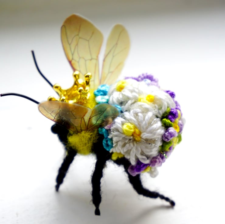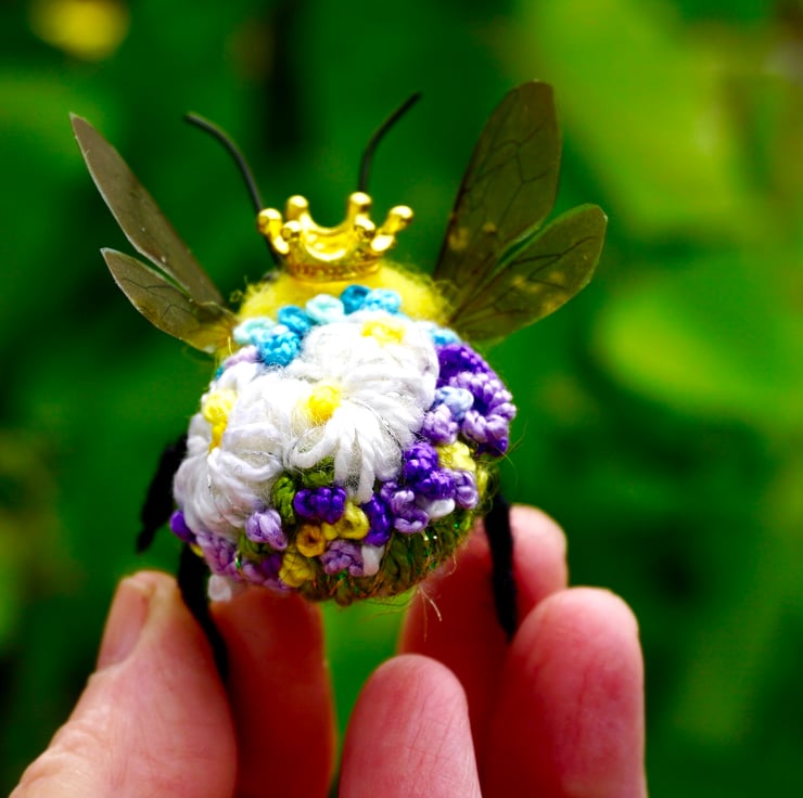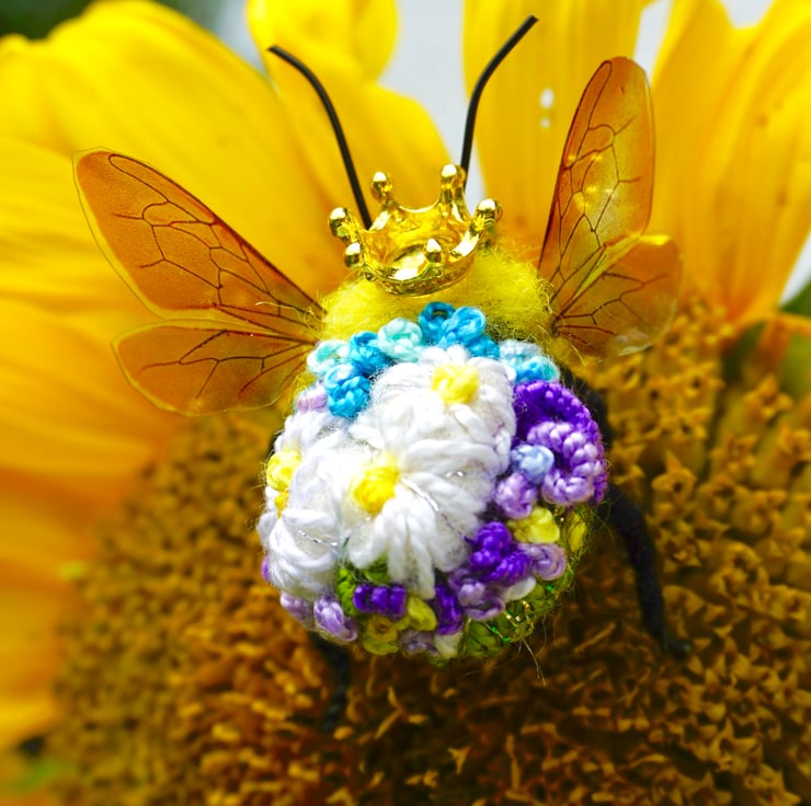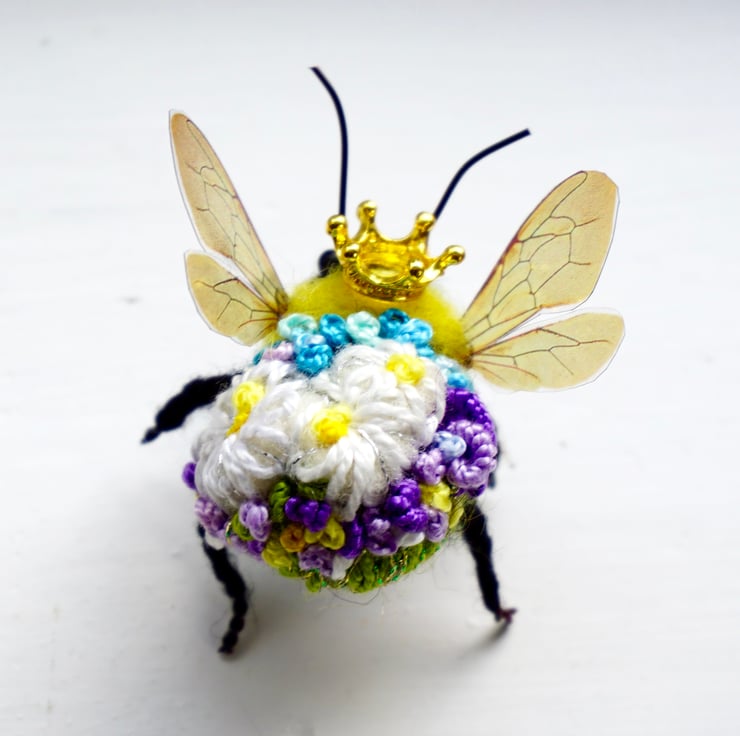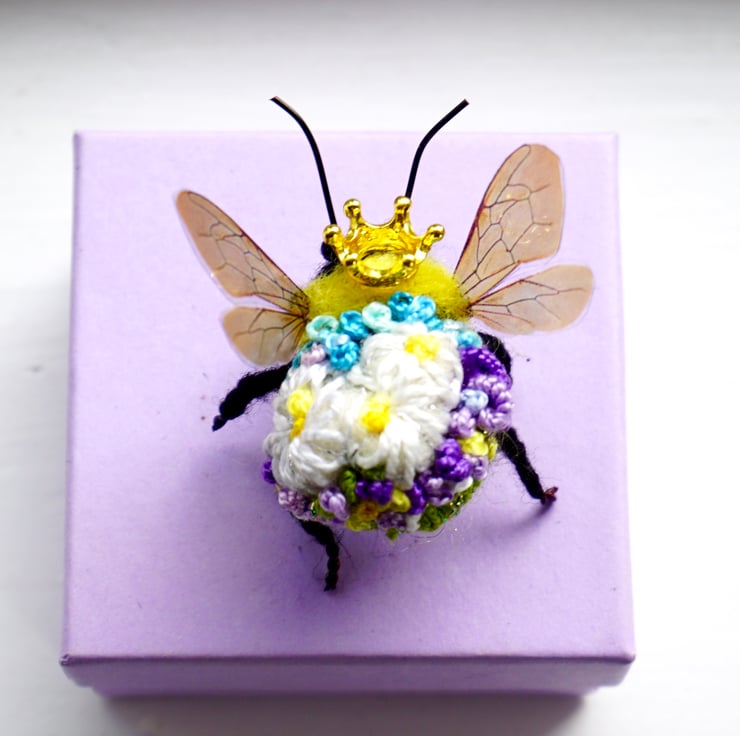 Needle felted and embroidered queen bee, with metal crown,measures approx 3 cm long by 5cm wide .Your bee will come with a fine gold hanging thread ,which can be snipped off if not required,Gift box included.This is actual bee you can purchase.