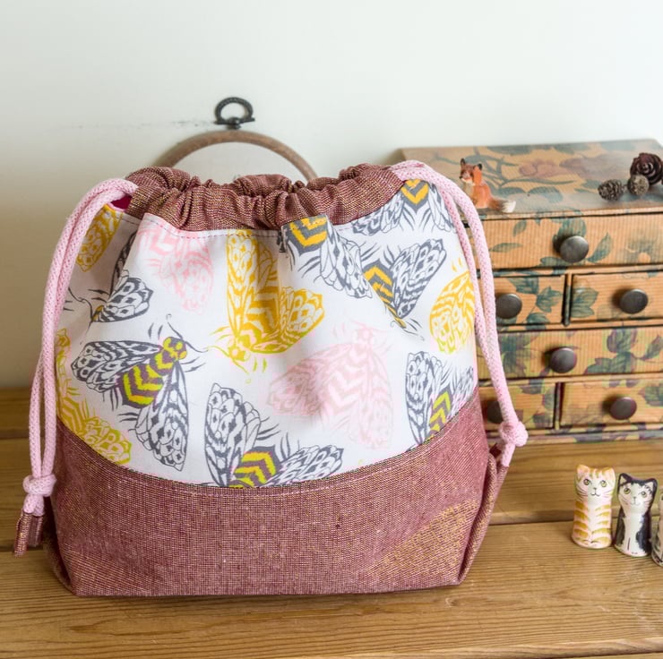 The corners of the bag are folded to create pretty triangle shapes that flatten the bottom of the bag and help it stand on it's own so you can work out of it. I also add a yarn guide in the lining made with the Essex Linen, which opens with a metal press stud. The drawstrings are a lovely soft cotton woven cord in a matching pink shade, and I seal the ends by adding some matching fabric tape, for a tidy finish.