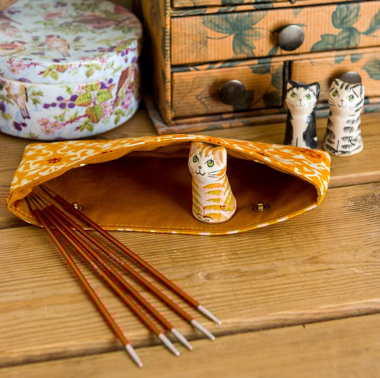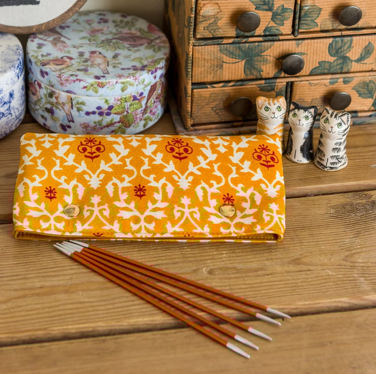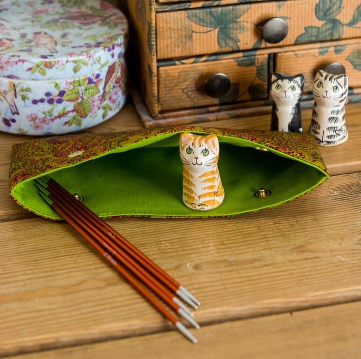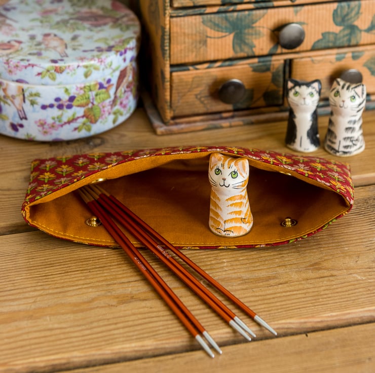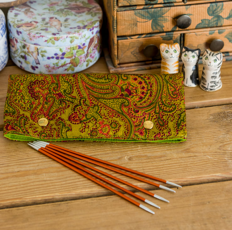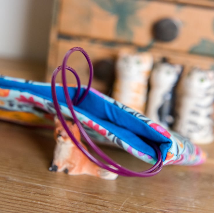 I offer the cosy in 3 prints and two sizes for 8" or 6" needles and another option to add a 3rd snap to the 8" size so that it can be used with circular needles, if magic loop is your thing. You can see how this works in the last 3 photos - essentially, you put your tips together into the left of the cosy, the cable sits to the right, above the right hand snap, and you push another loop of the cable around the extra snap to secure it.