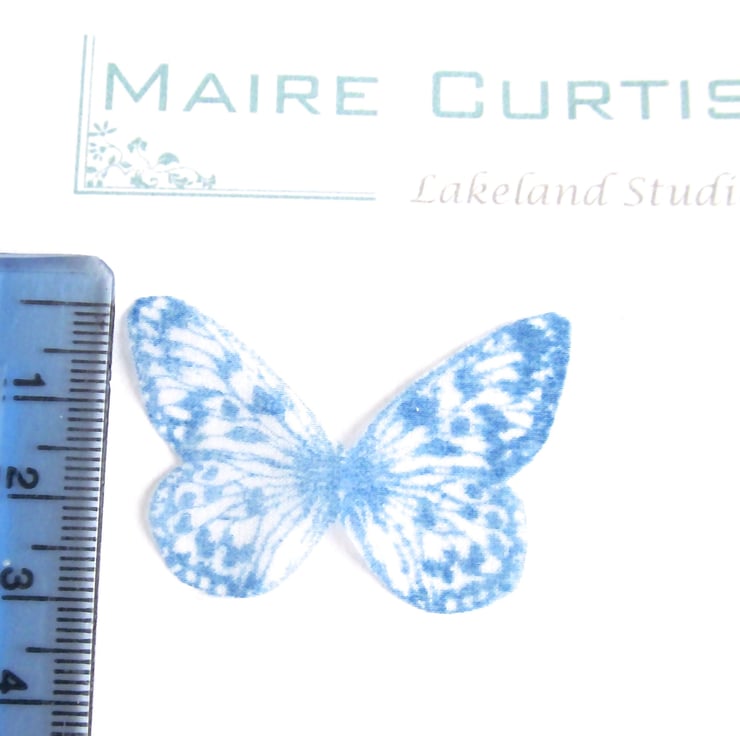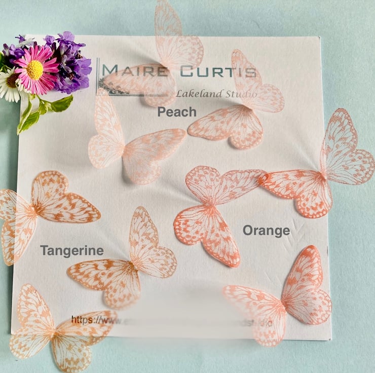 High quality silk organza is hand block printed using the finest Japanese ink dyes and stiffened in the same way we do to make silk flowers and this is then cut to create these gorgeous, delicate butterflies.