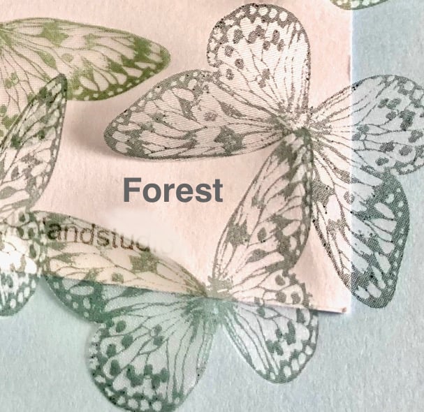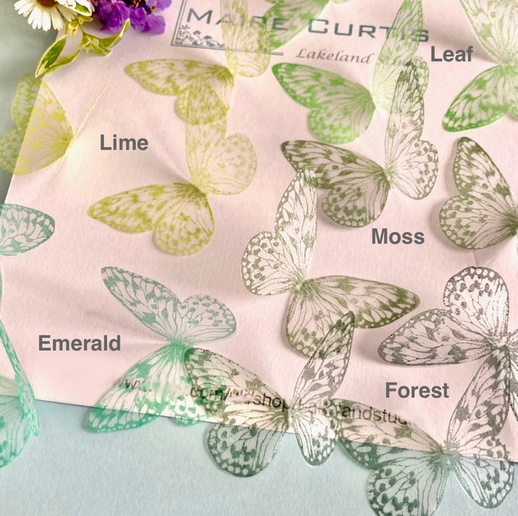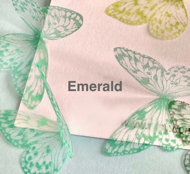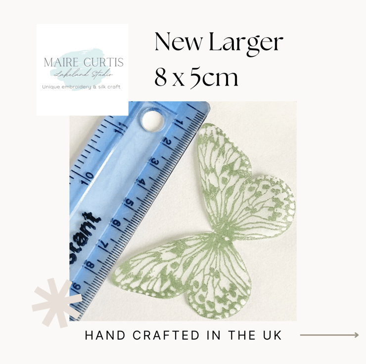 Hand printed pure silk organza butterflies in a choice of green shades and two sizes.