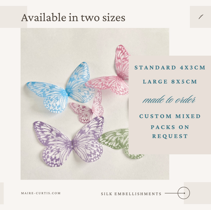 High quality silk organza is hand block printed using the finest Japanese ink dyes and stiffened in the same way we do to make silk flowers and this is then cut to create these gorgeous, delicate butterflies.