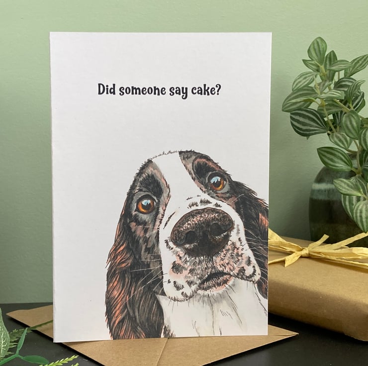Springer spaniel birthday card (or personalised for any occasion; birthday, Valentine’s day, Mothers Day, Fathers Day, Thank you, Wedding, Anniversary or Christmas perhaps). This blank brown and white spaniel dog card features a print of my original hand drawn and painted illustration of a liver and white spaniel. I particularly like the sentiment "Did someone say cake?" which covers any celebration involving cake.