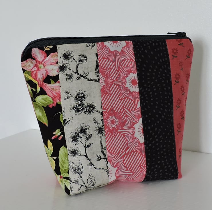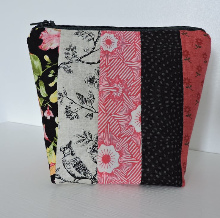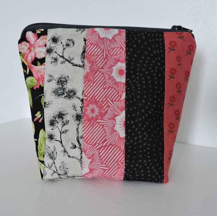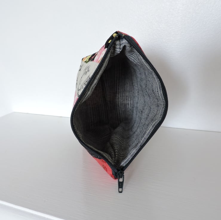 Clearance item. This pretty make up bag has been made with assorted strips of cotton fabrics. The strips are floral and geometric and the main colours are red, grey, and black with a smattering of yellow and green. The inner fabric is a two tone grey/blue striped fabric. Interfacing has been used to give stability to the bag, has a squared off bottom and is finished with a dark grey top zip.