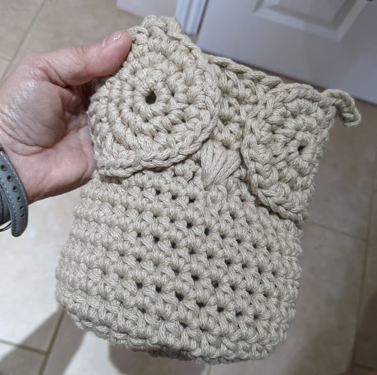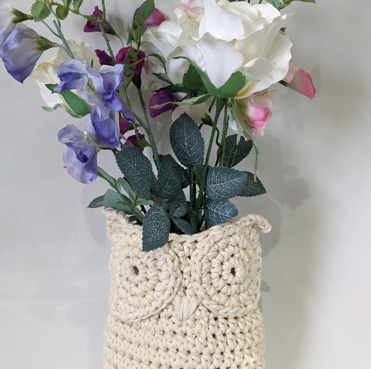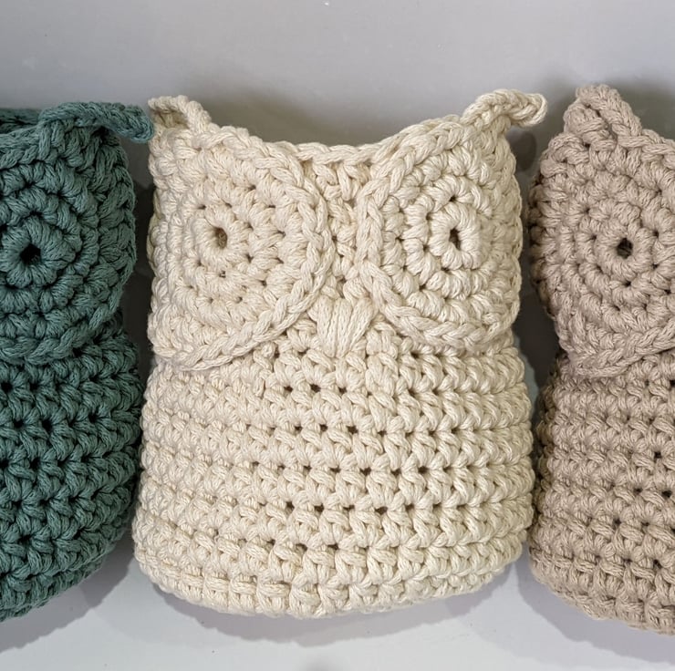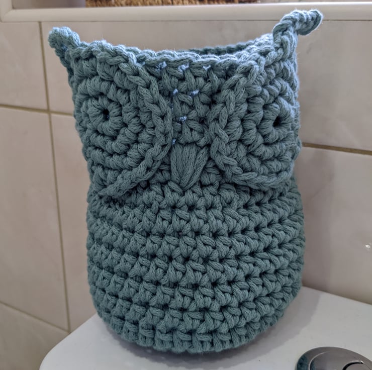 A cute crocheted owl basket, made with a 100% cotton braided cord. The item is sturdy and keeps its shape and with a choice of colours you are bound to find one to suit any colour scheme.
