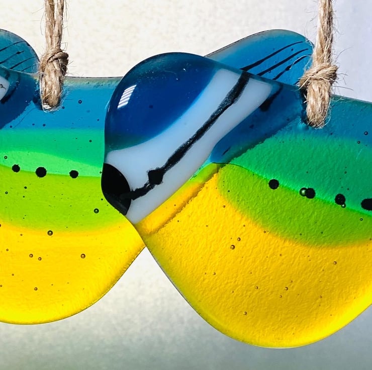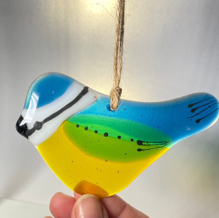 The fused glass is totally smooth and the blue tit is drilled with a clear thread hanger so as to hang in a balanced position .