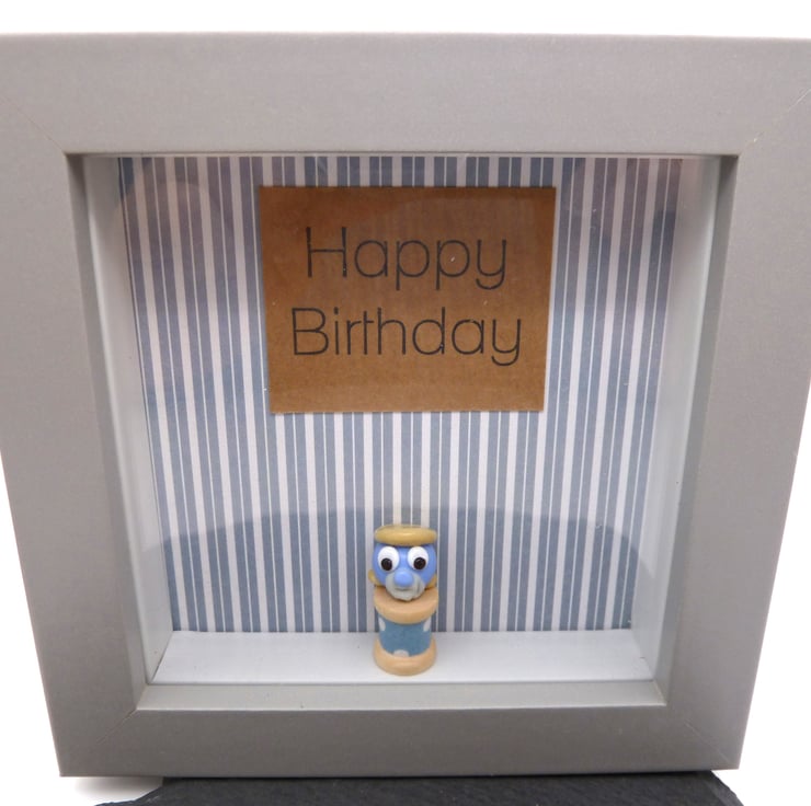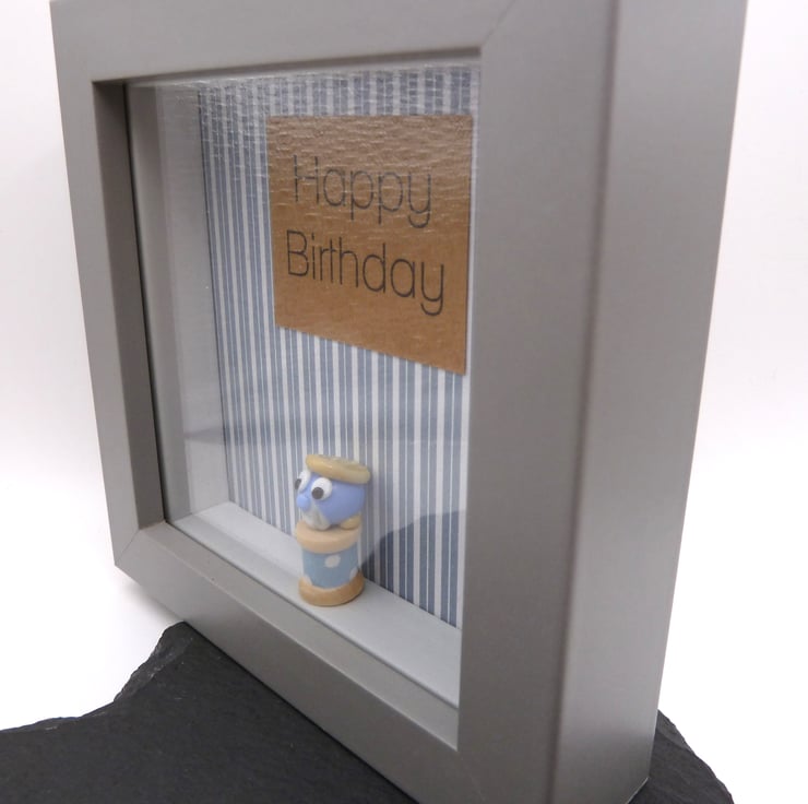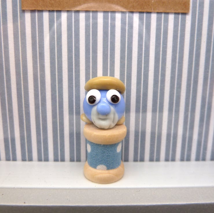 A grey picture box frame which features a handmade lampwork glass blob sat on a wooden bobbin. The blob has a beard and a flat cap.