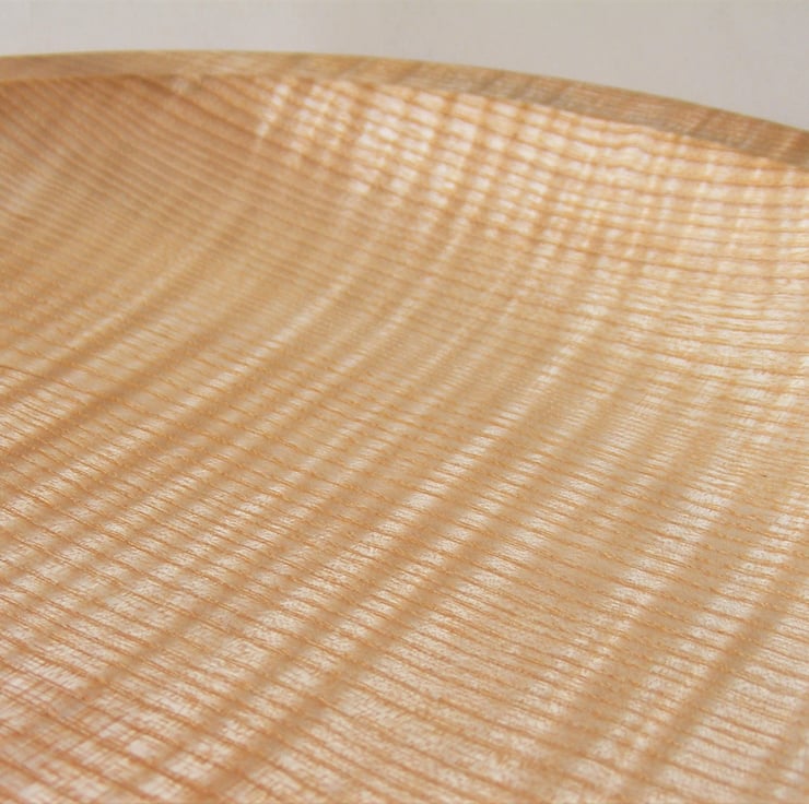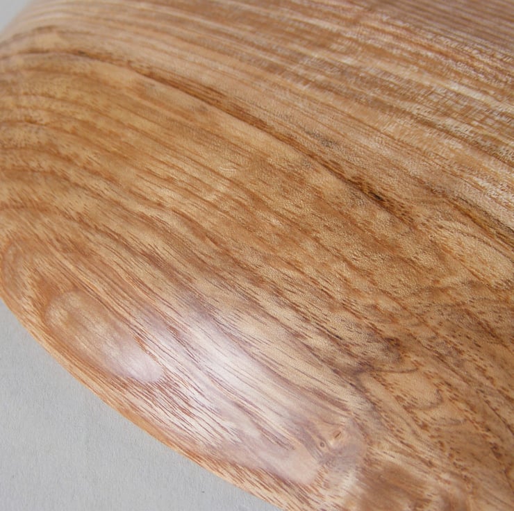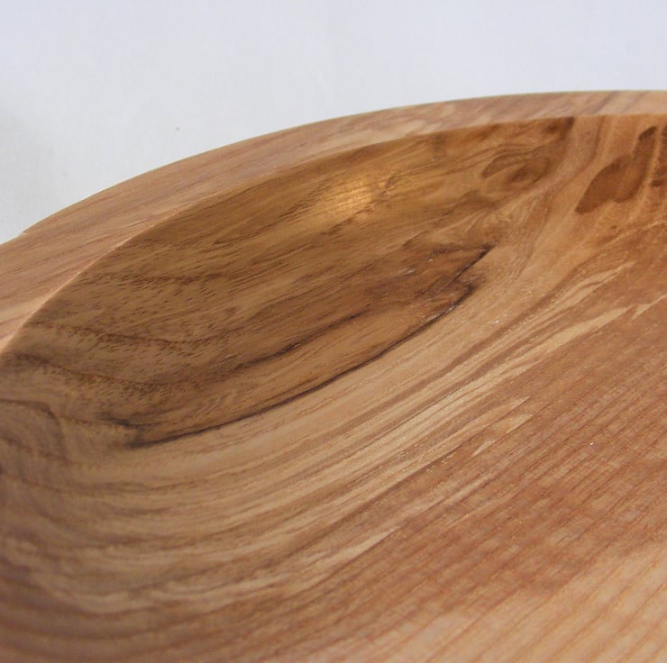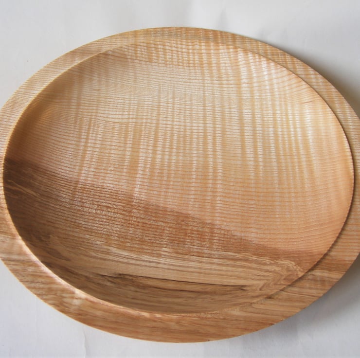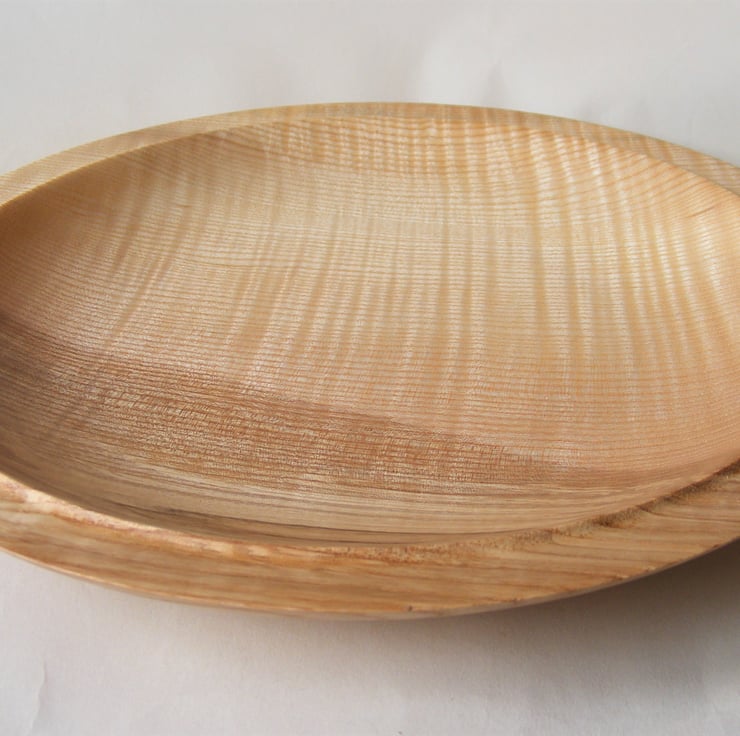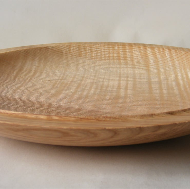 Rippled Ash Serving platter. 258 x 34mm (25.8 x 3.4 cm) Gently curving Ash platter with a double rim. The piece has a large section of creamy Ash outer wood and a section of darker streaked Olive ash to one side. The piece is in rippled Ash, which creates lovely patterns in the wood, that look almost 3D in the light. It would make a lovely serving platter or a decorative item.