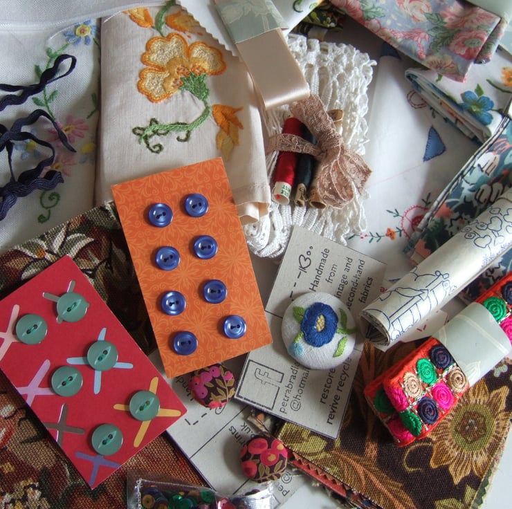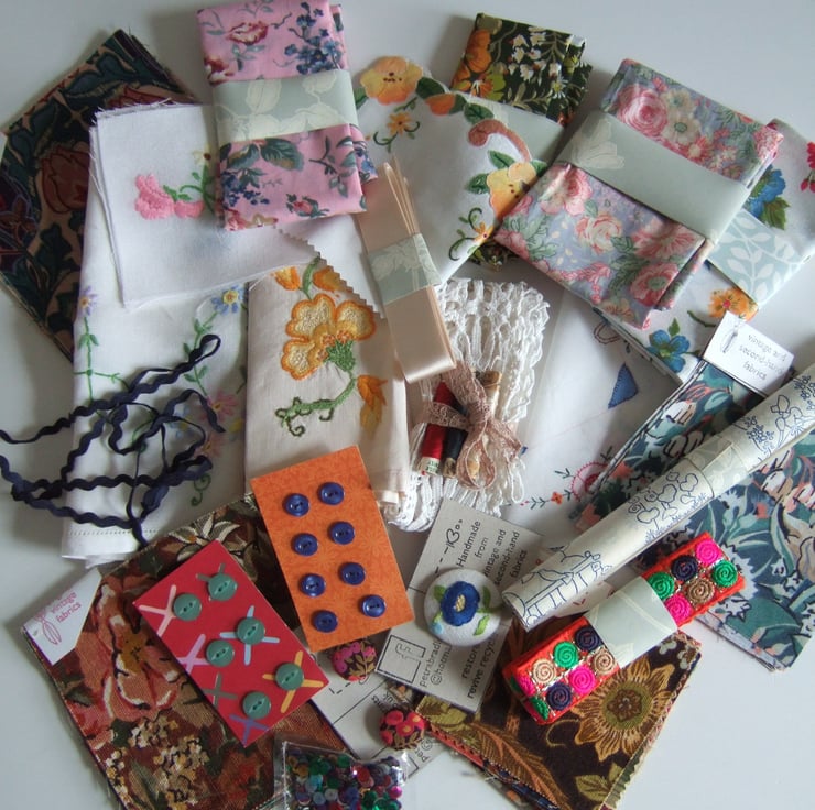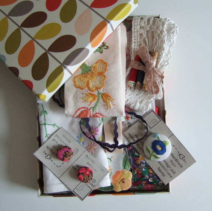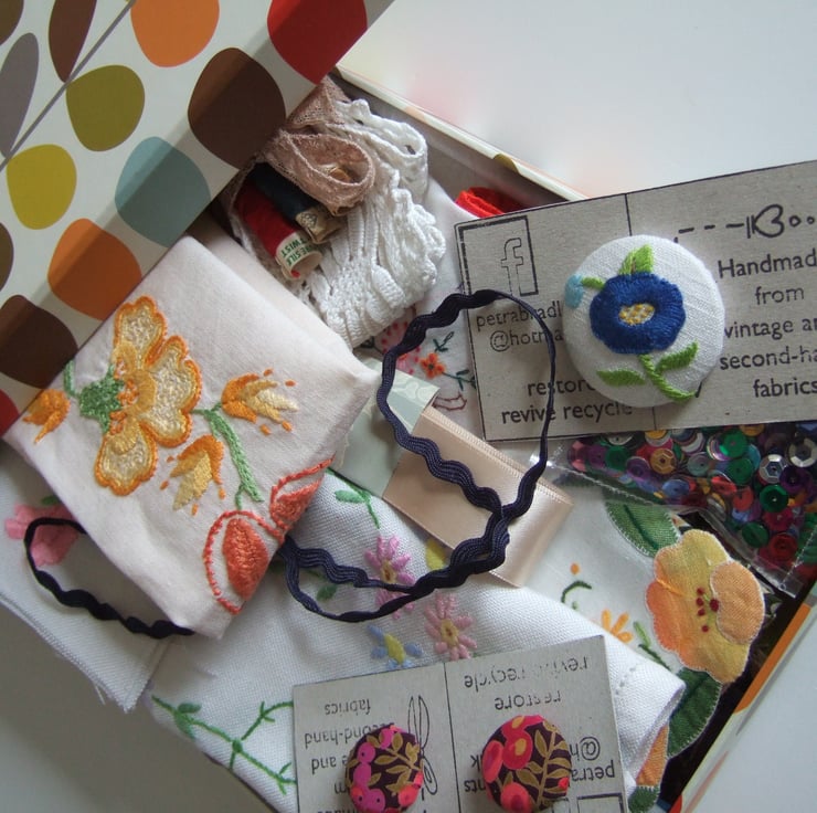 I hope this little box of vintage haberdashery will spark your ideas, inspiration and creativity. Bits of ribbon, braid and lace, cotton fat quarters and patchwork squares. Fragments of vintage hand embroidered flowers, and some buttons thrown in for good measure. Perfect if you are learning to sew, teaching some sewing at home, or you would like to try out some upcycling ideas. These little embellishments will make your work that bit special, and add a sprinkling of history to whatever you decide to create. This would make a nice gift for someone who enjoys recycling, for someone learning to sew, or as a holiday project.