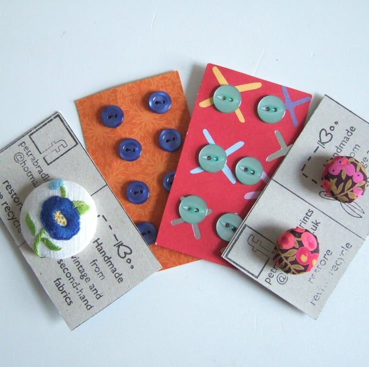 A pair of Liberty fabric covered buttons, 2 sets of new buttons, and one covered in vintage embroidery .