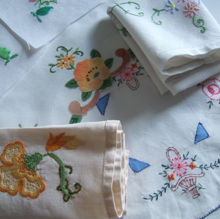 Hi there and welcome to my shop. Here you will find old embroideries, vintage fabrics and sparkling remnants made into something pretty and practical once again. I re-stock slowly but surely, so do keep coming back for a browse.