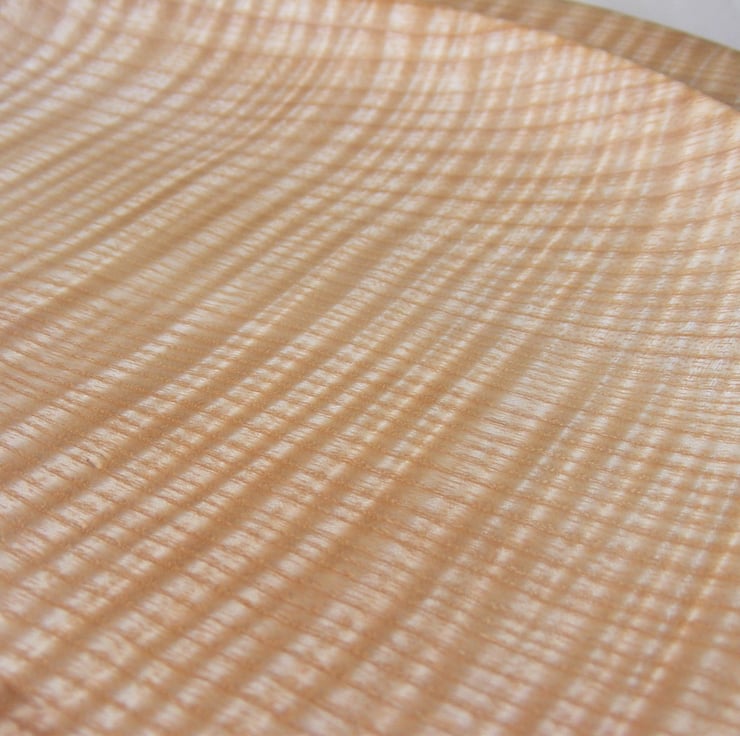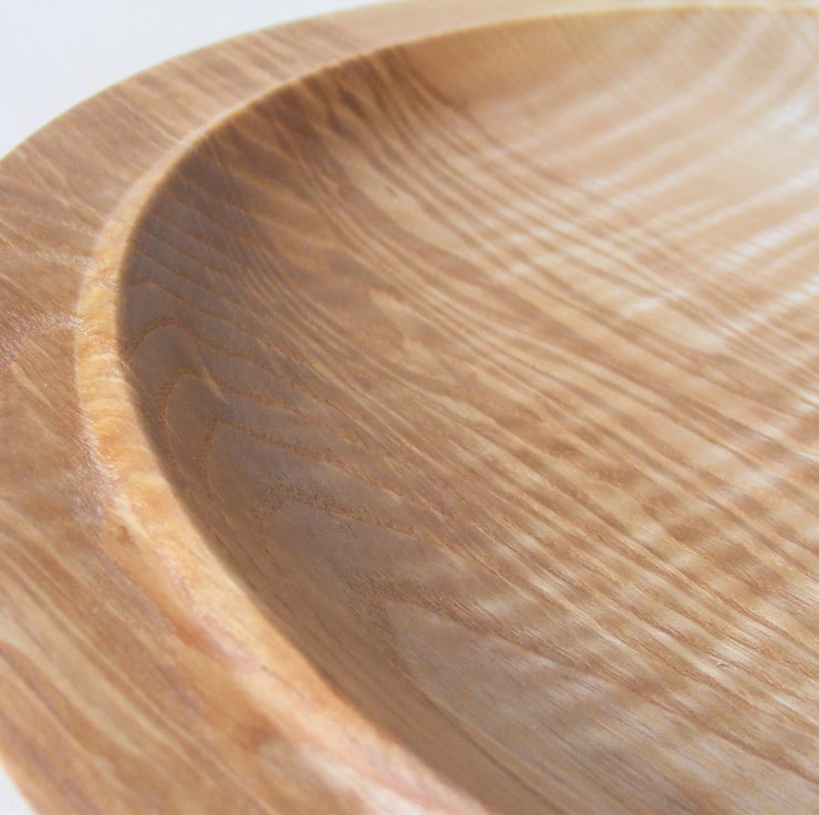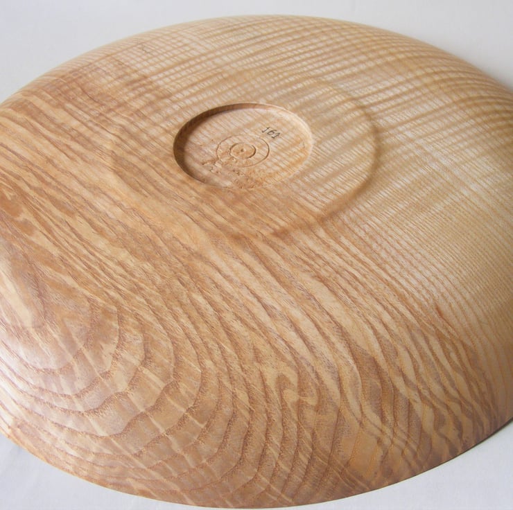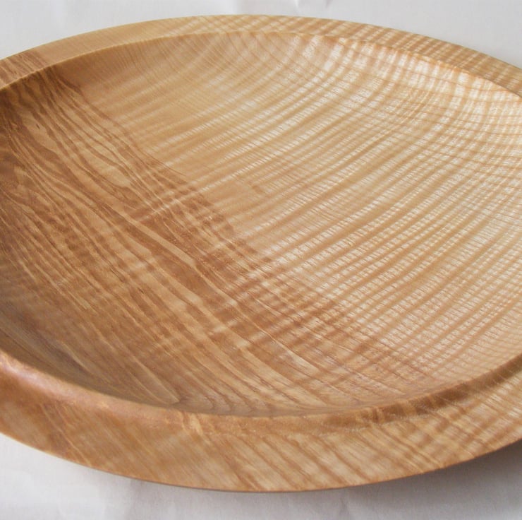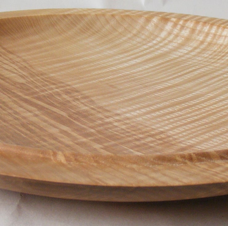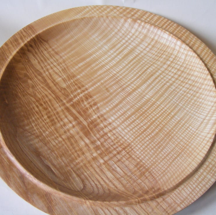 Large Rippled Ash Platter, 322 x 31mm (32.2 x 3.1 cm). A striking large rippled Ash platter, it has a gently curving shape and a double rim. Two thirds is creamy ash colour while the rest is darker brown with streaks and waves of colour. Ripples in the grain run through the whole piece adding a lovely wave pattern that looks almost 3D in the light. It would make a fantastic centre piece for the home or a ideal serving platter for a special occasion.