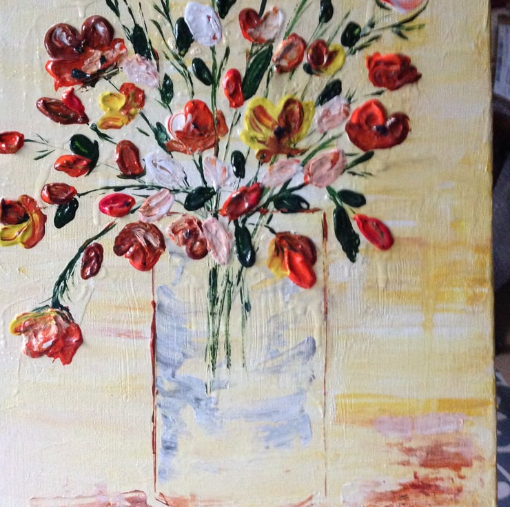 Using a palette knife and colours orange , yellow, white , red. on canvas .