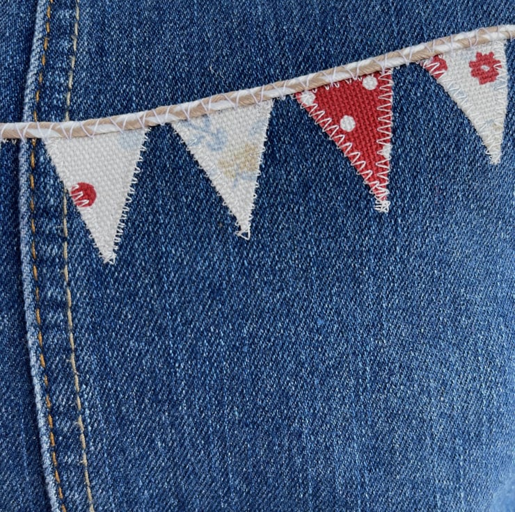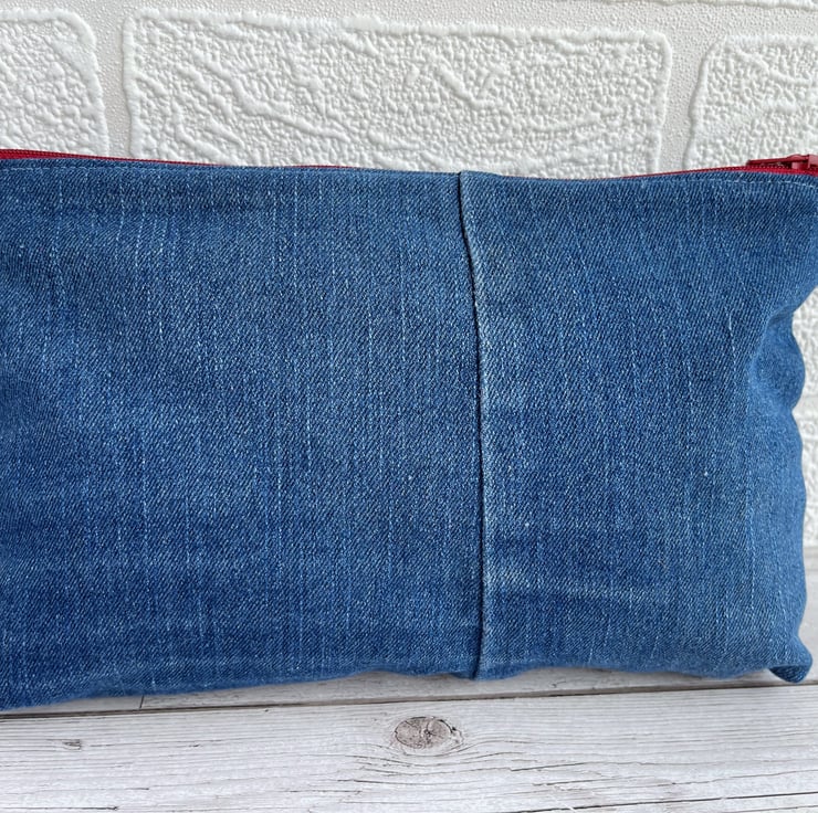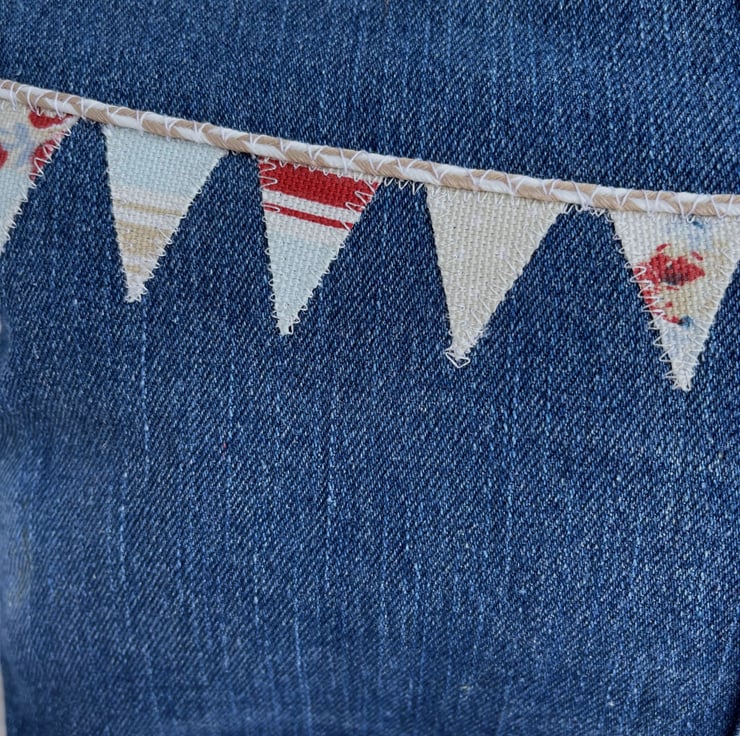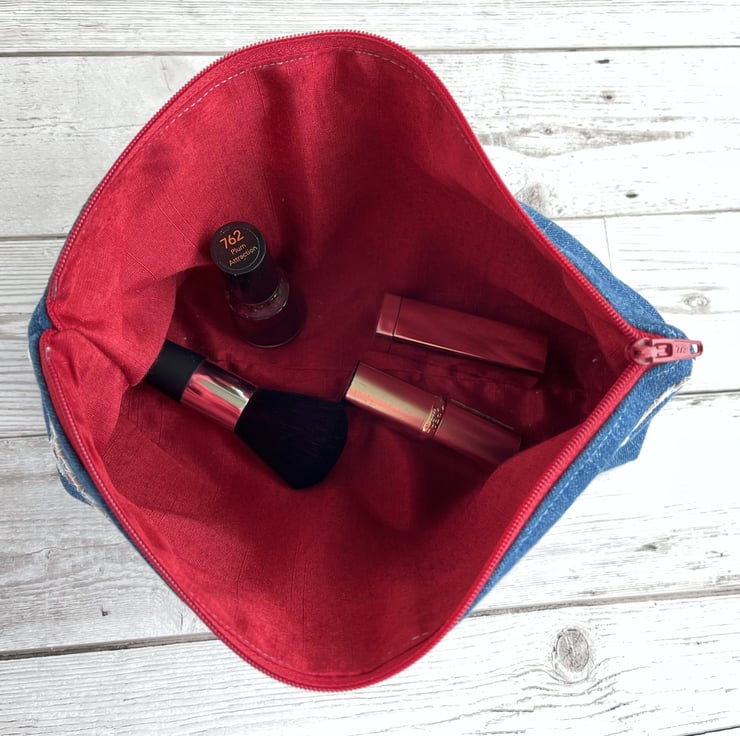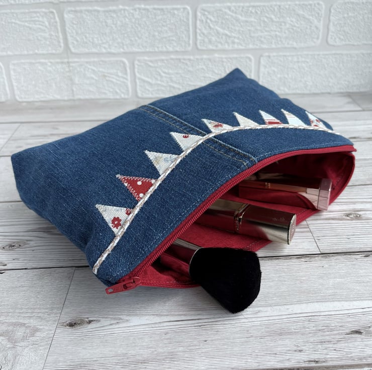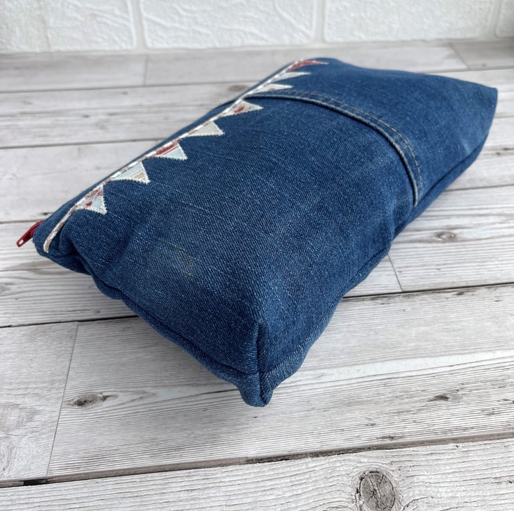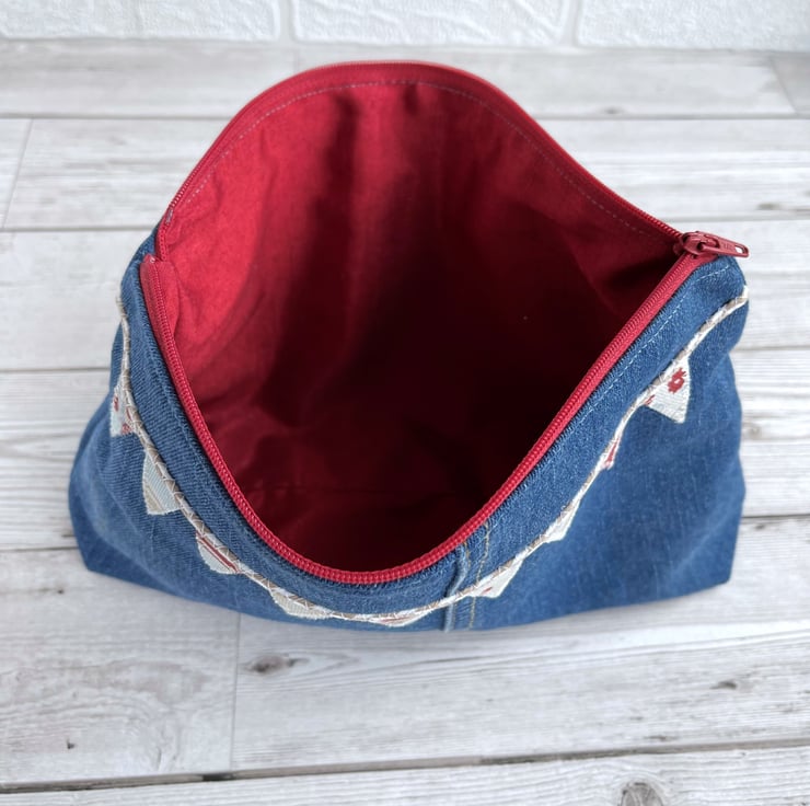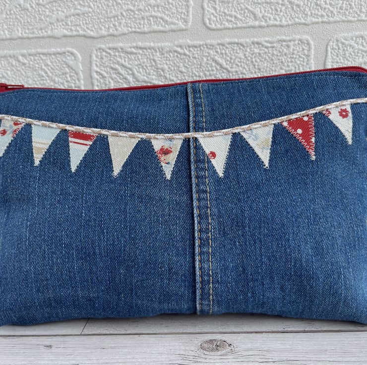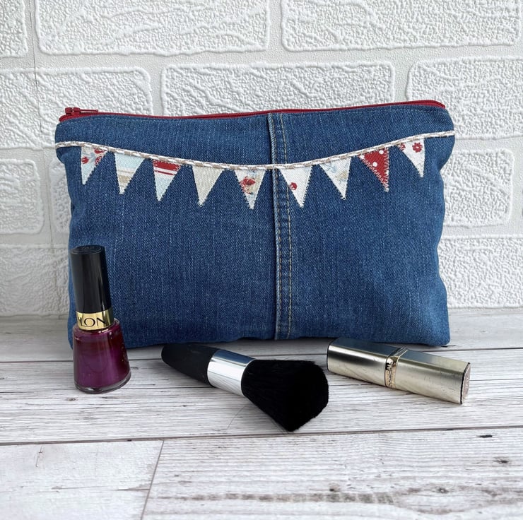 Large upcycled denim make up bag with bunting. This large sized cosmetic bag is made from upcycled blue denim from a pair of jeans. I've cut the fabric to incorporate some of the original seams and make a feature of them. The front of the make up bag is embellished with appliqué bunting. The flags are made from small offcuts from different sections of a piece of patchwork print fabric, and therefore co-ordinate beautifully with each other. The patterns include stripes, polka dots and ditsy florals in nautical shades of white, pale blue, beige and red. The bunting string is made from beige and white decorative twine. The cosmetic bag fastens with a matching red zip and is lined with red fabric with a slight sheen. The base of the bag is boxed giving lots of space inside. Please note, the denim has a slight faint mark on the far left edge of the front. This is the nature of pre-loved, upcycled materials, and the denim was thoroughly washed before use.