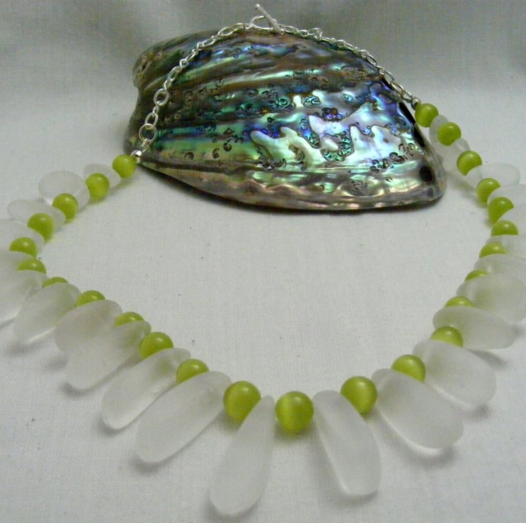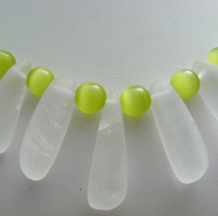 Necklace is handmade with, white quartz irregular gemstone drops, 8mm lime green glass cat's eye beads, silver plated findings, silver plated chain and toggle clasp.