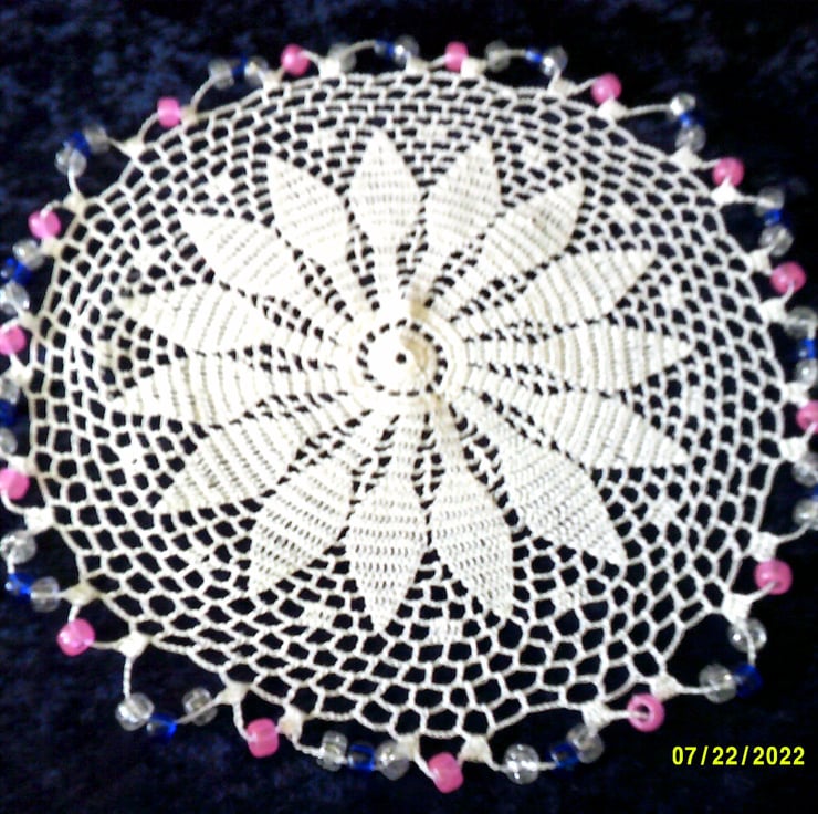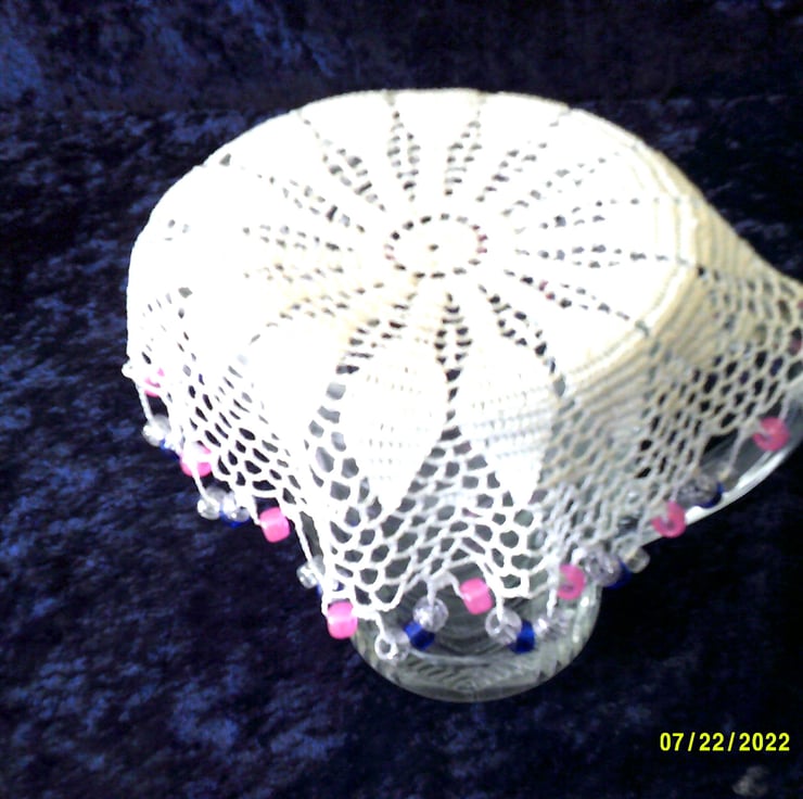 This crocheted Jug Cover or Bowl cover is made using fine crochet cotton in white with Pink, Blue and Clear beads around the edge to keep it "weighted" down over your jug or sugar bowl / small bowl of salad when you are dining alfresco.