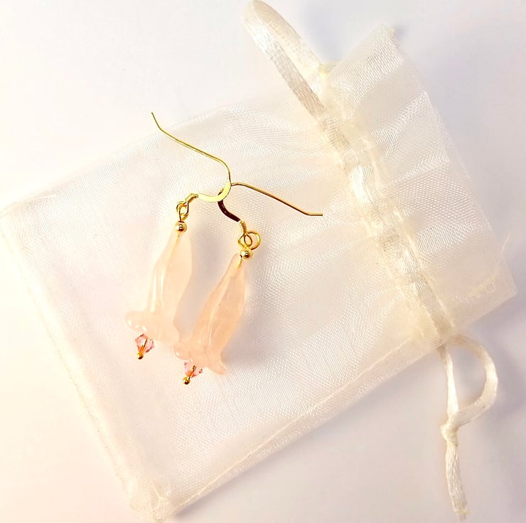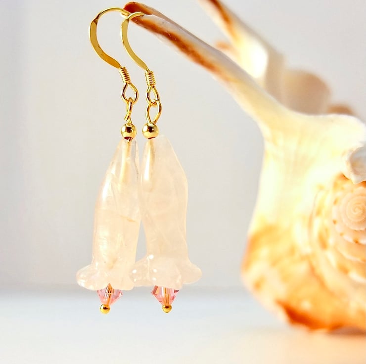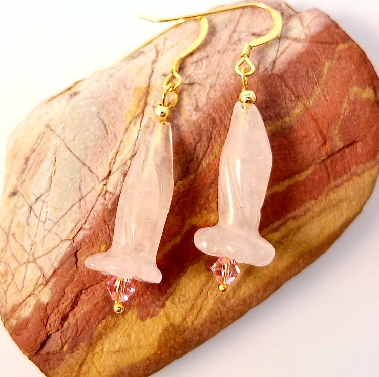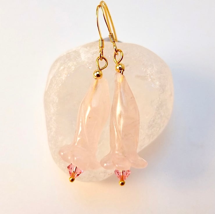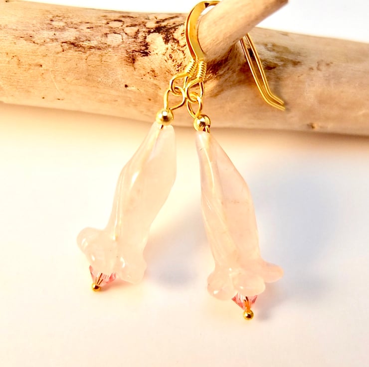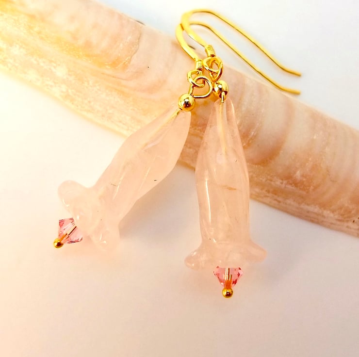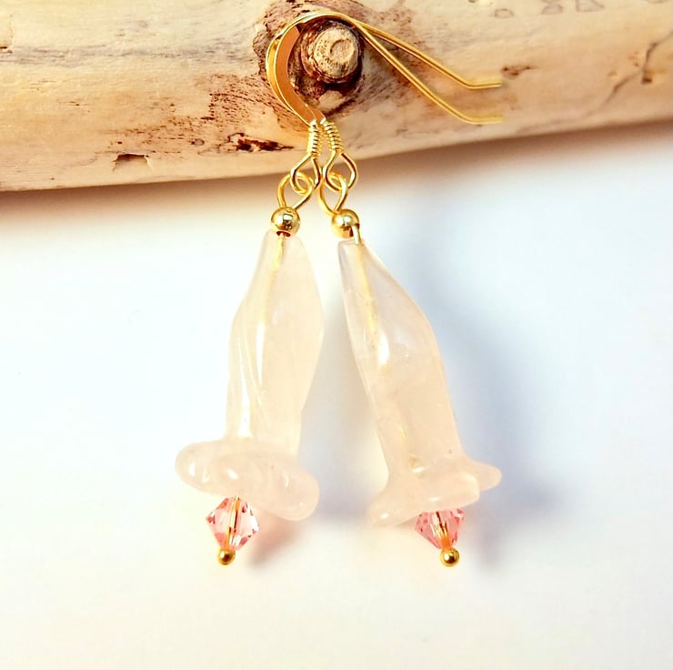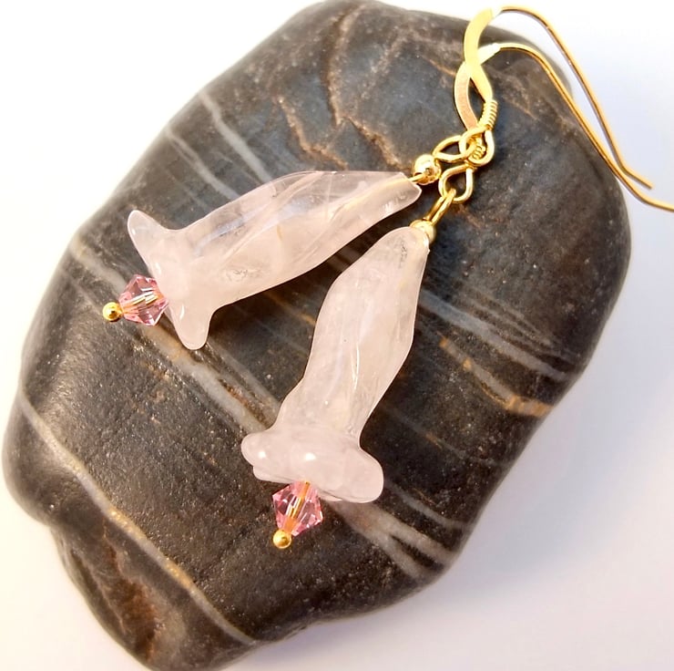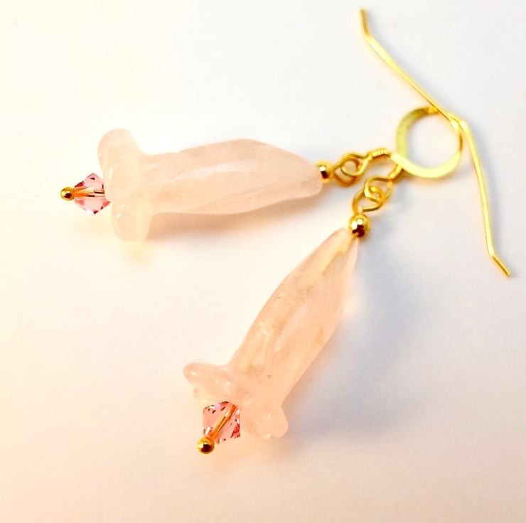 Palest pink, Rose Quartz Earrings carved in the shape of a flower, set with a Swarovski 'light rose' crystal and hung from gold vermeil ear-wires.