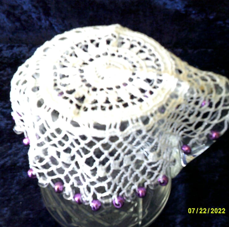 This crocheted Jug Cover or Bowl cover is made using fine crochet cotton in white with Shiny Purple and Clear beads around the edge to keep it "weighted" down over your jug or sugar bowl / small bowl of salad when you are dining alfresco.