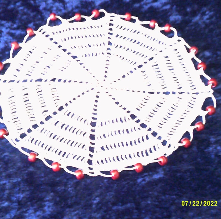 This crocheted Jug Cover or Bowl cover is made using fine crochet cotton in white with Burgundy coloured beads around the edge to keep it "weighted" down over your jug or sugar bowl / small bowl of salad when you are dining alfresco.